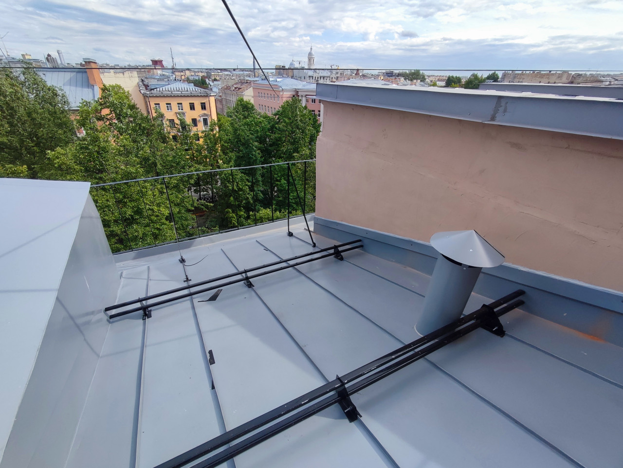 крыша кровля металлическая кровля фальцевая кровля ремонт кровли город архитектура крыши металлическая крыша снегозадержатели кровельное ограждение вентиляционная труба инженерные системы коммунальные службы обслуживание домов эксплуатация зданий безопасность высотные работы городская панорама жилые дома двор деревья провод небо облака Санкт Петербург Петроградский район строительные технологии городская среда инфраструктураПохожие фотографии