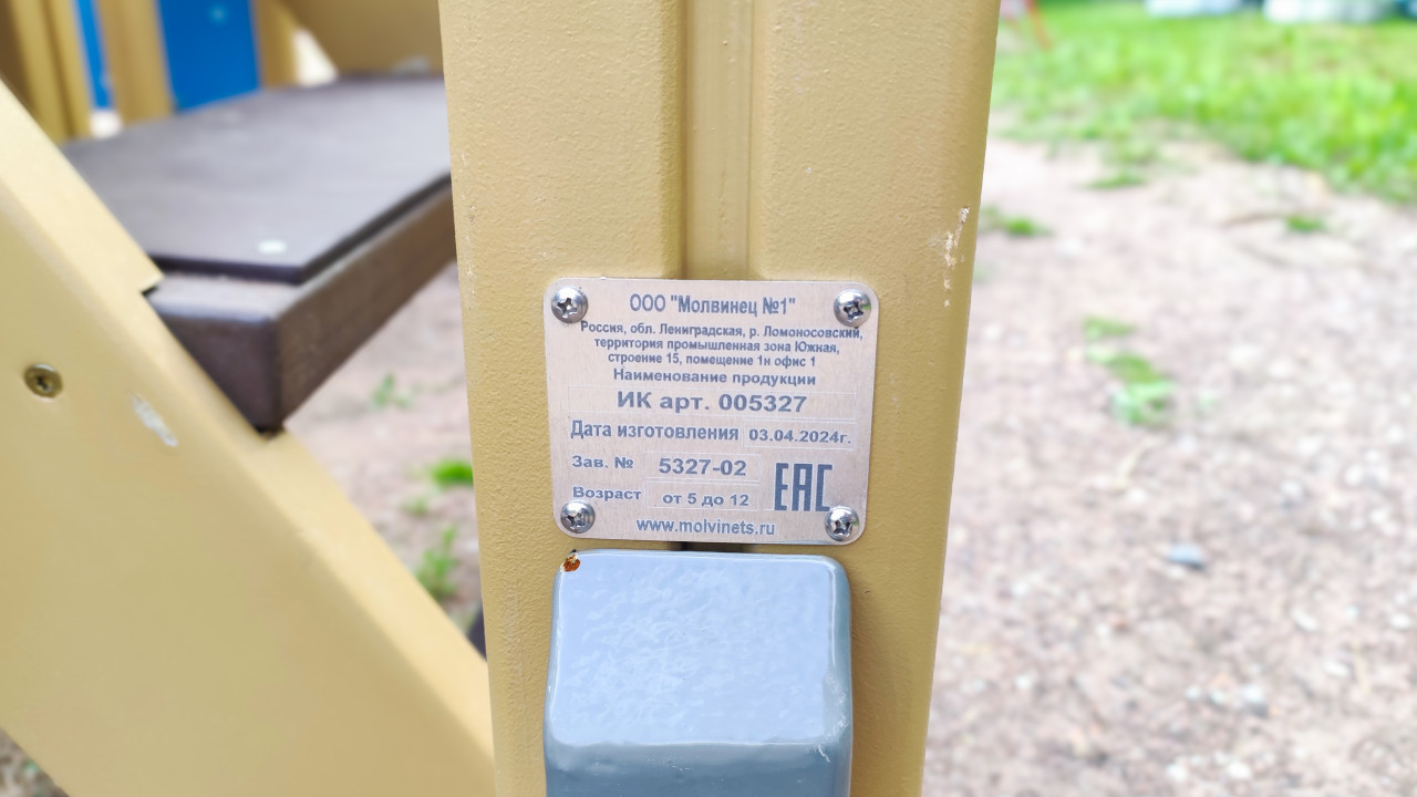 благоустройство детская площадка детские развлечения детский отдых детский досуг детское оборудование игровая зона игровое оборудование игровая площадка игровой комплекс развлечение физическая активность шильдик табличка производителя маркировка артикул дата изготовления серийный номер ООО Молвинец №1 Molvinets EAC возрастные ограничения безопасность детей крупный план металлическая пластина винты стойка конструкции окрашенный металл уличное оборудование паспорт изделия контроль качества дворовая территория Санкт Петербург МО Автово апрель 2024 детская горка эксплуатацияПохожие фотографии