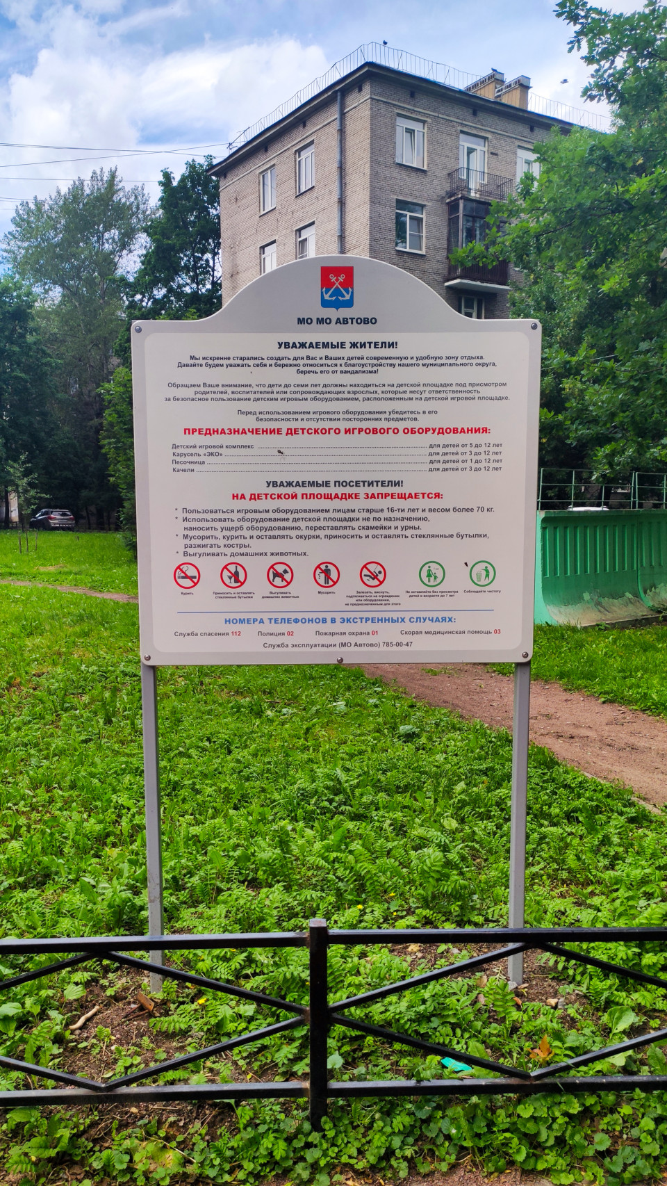 благоустройство детская площадка детские развлечения детский отдых детский досуг детское оборудование игровая зона игровое оборудование игровая площадка игровой комплекс развлечение физическая активность Санкт Петербург МО Автово информационный щит правила безопасность предупреждение муниципальный округ городская среда двор жилой квартал многоквартирный дом кирпичный дом зеленая зона газон тропинка ограждение пиктограммы запреты номера экстренных служб 112 табличка уличная инфраструктура лето пасмурное небо общественное пространствоПохожие фотографии