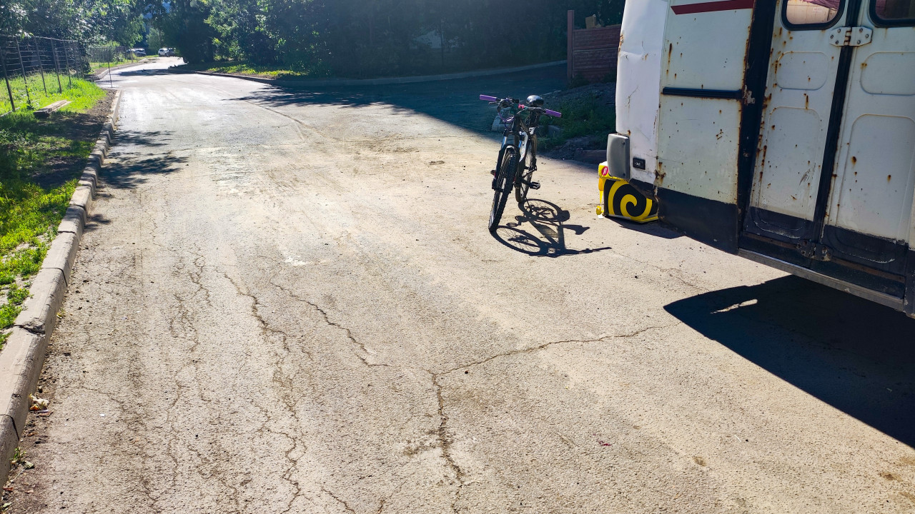 Июнь 2024: в кадре участок асфальтового покрытия с заметной сеткой трещин и неровностями, по поверхности видны пятна пыли и следы износа. В средней части стоит велосипед, от которого падает резкая тень; справа в кадр входит боковая стенка старого автобуса с ржавыми точками и тёмными резиновыми уплотнителями. Слева тянется бордюр и зелёная полоса, впереди дорога уходит в тень деревьев, видны забор и кусты. Фото подходит для материалов о состоянии дворовых покрытий, ремонте асфальта и безопасности движения велосипедистов.