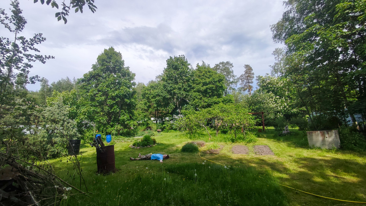 Газон на участке с бочкой, шлангом и грядками среди деревьев