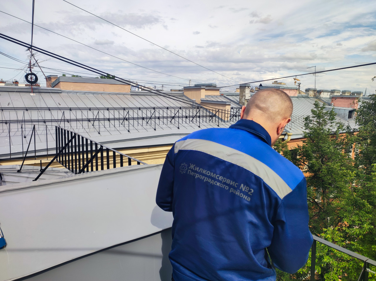 На фото человек в рабочей куртке синего цвета стоит на металлической крыше у ограждения; на спине читается надпись «Жилкомсервис №2 Петроградского района». Вокруг — фальцевая кровля, элементы снегозадержания на соседних скатах и сеть проводов, пересекающих кадр. На заднем плане видны крыши городских домов, слуховые надстройки и деревья во дворе. Снимок иллюстрирует работу коммунальных служб и обслуживание жилого фонда. Использование: статьи о ЖКХ, эксплуатации зданий, техобслуживании кровли и безопасности высотных работ.