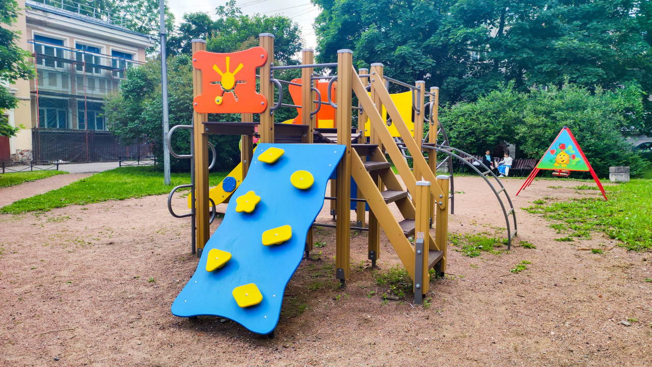 благоустройство детская площадка детские развлечения детский отдых детский досуг детское оборудование игровая зона игровое оборудование игровая площадка игровой комплекс развлечение физическая активность лазалка скалодром ступени горка пластиковые панели металлические поручни песчаное покрытие двор парк во дворе скамейка люди на скамейке детские игры семейная прогулка зеленые кусты деревья городская среда жилой дом ремонт фасада строительные леса Санкт Петербург МО Автово лето общественное пространство уличная инфраструктураПохожие фотографии