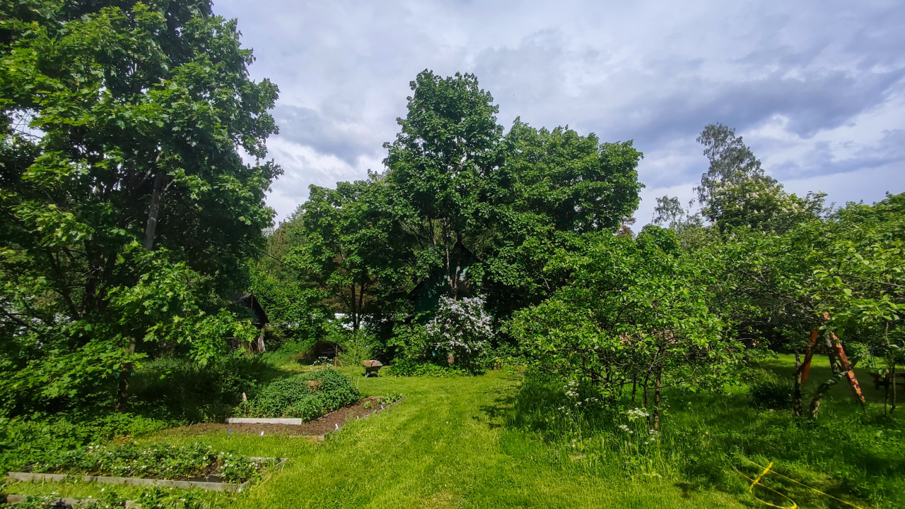 На фото запечатлён дачный участок с сочетанием газона и огородной зоны. Слева видны прямоугольные грядки с бортиками и участок обработанной земли, рядом растут кусты и деревья. В центре проходит полоса косёной травы, в глубине заметен цветущий куст с белыми соцветиями и плотная крона высоких деревьев. Справа в кадре находятся садовые посадки и оранжевая лестница или опора возле зелени. Небо пасмурное. Снимок подойдёт для материалов о огороде, сезонных работах, устройстве грядок и дачном быте.