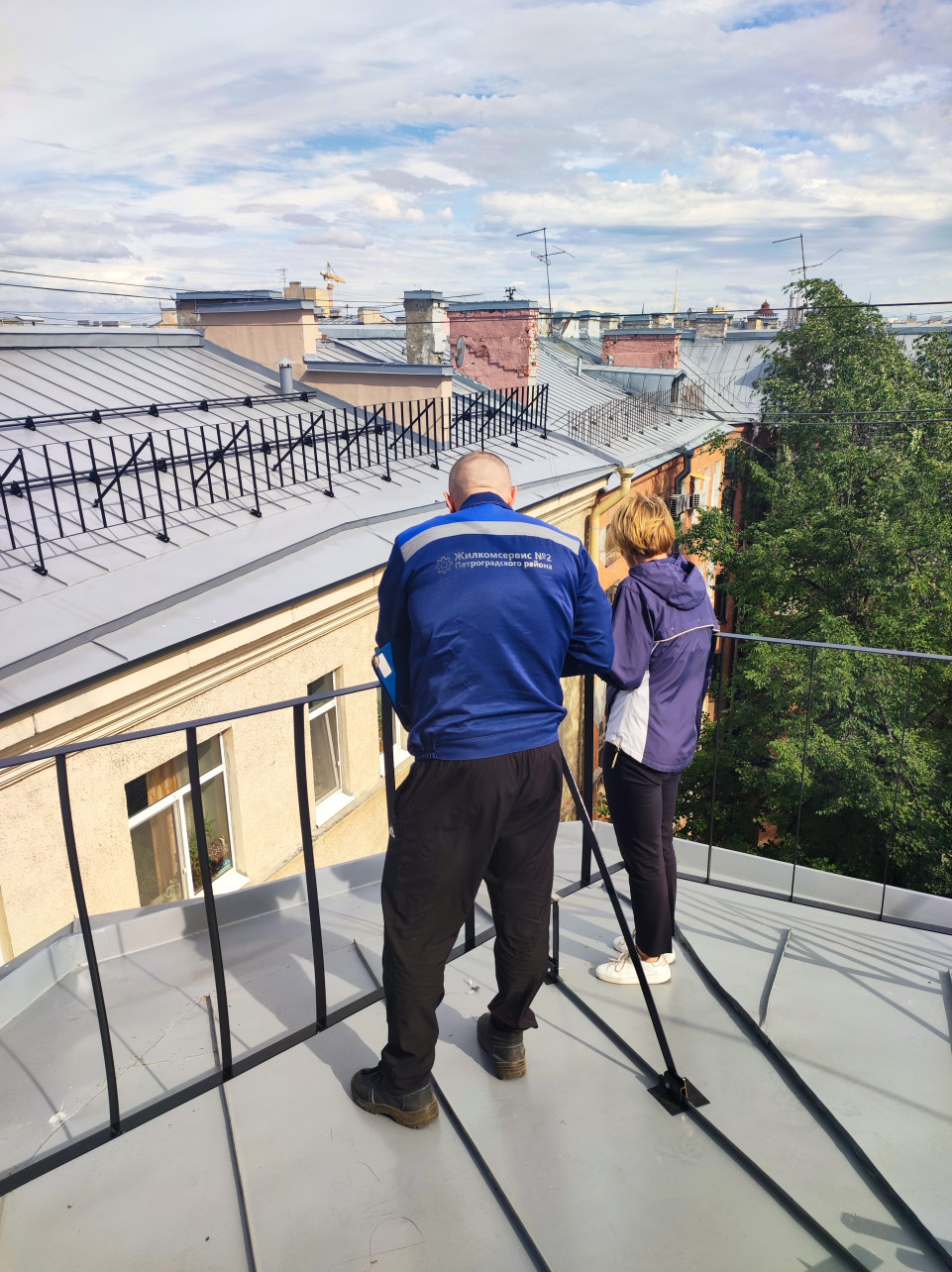 Работы на крыше у ограждения на фоне неба и панорамы городских домов