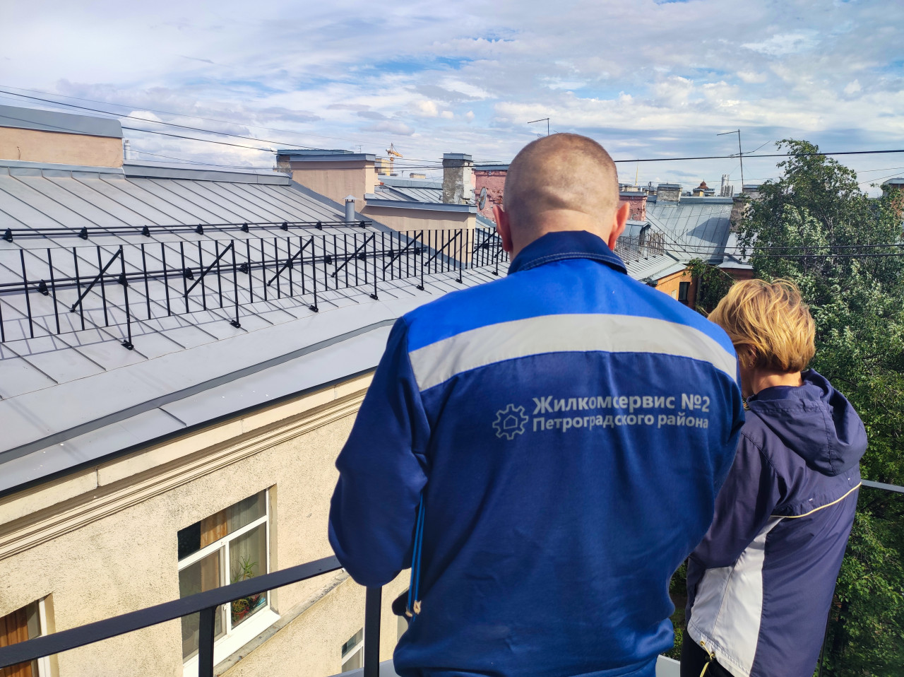 На крыше жилого здания стоят двое людей у ограждения: мужчина в спецкуртке с надписью «Жилкомсервис №2 Петроградского района» и женщина в куртке с короткой стрижкой. В кадре — металлическая фальцевая кровля, снегозадержатели, перила, провода и антенны, вдалеке видны крыши соседних домов и фрагменты кирпичных стен. Освещение дневное, на небе слоисто-кучевые облака. Подходит для иллюстраций о работе коммунальных служб, проверке состояния кровли, управлении жилфондом и охране труда.