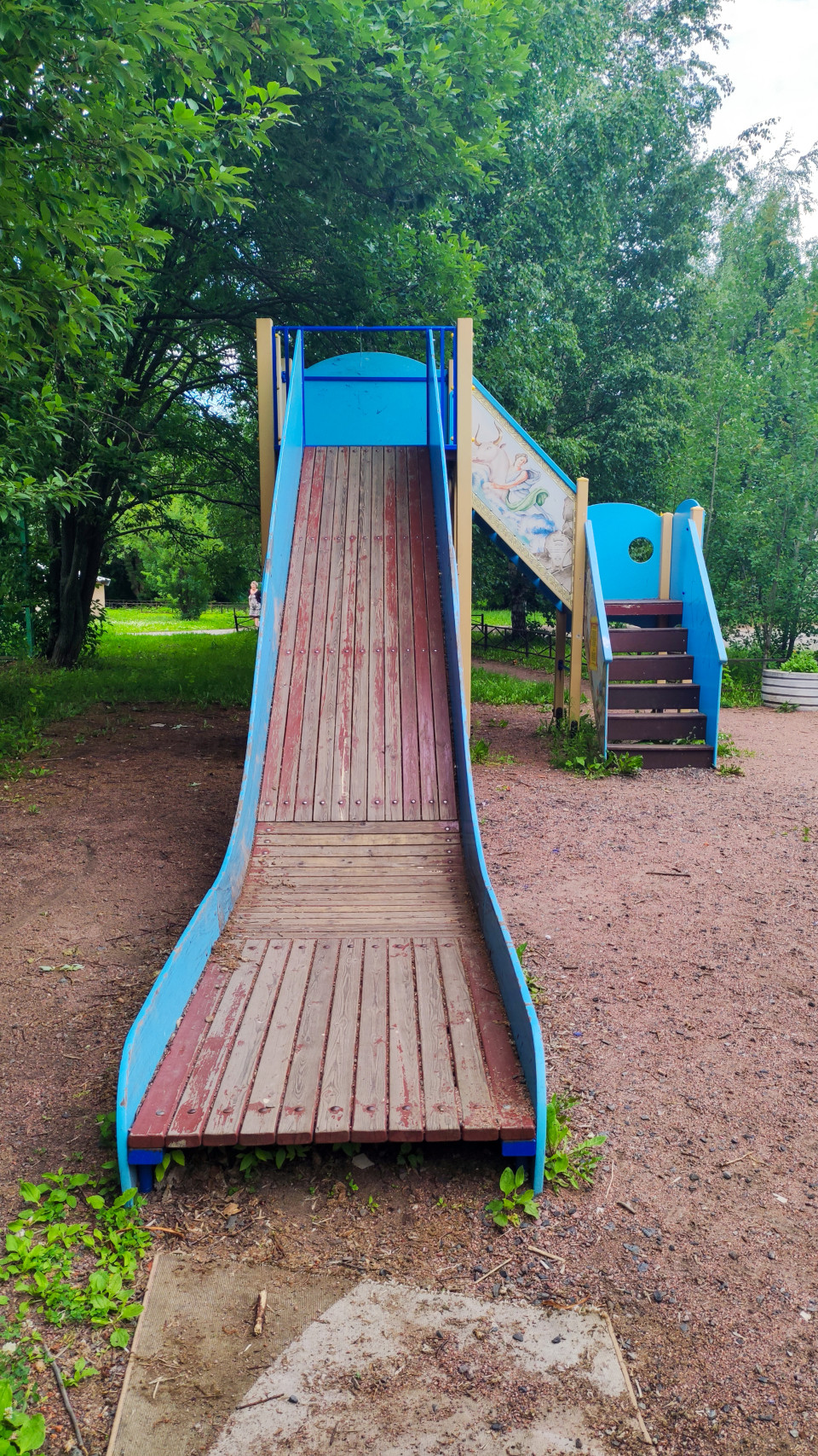Июнь 2024 года: на фото детская площадка в зелёной зоне, в центре деревянная горка-скат с широким настилом и голубыми бортами. Сбоку расположена лестница с перилами и декоративной панелью с рисунком, рядом видны гравийно-песчаное покрытие и участки земли с травой. Площадка окружена деревьями и кустами, на заднем плане просматриваются дорожка и элементы дворового ограждения, вдалеке проходит человек без различимых деталей. Кадр подходит для материалов о детской инфраструктуре, благоустройстве парков и дворов, семейном отдыхе и городских зелёных территориях.