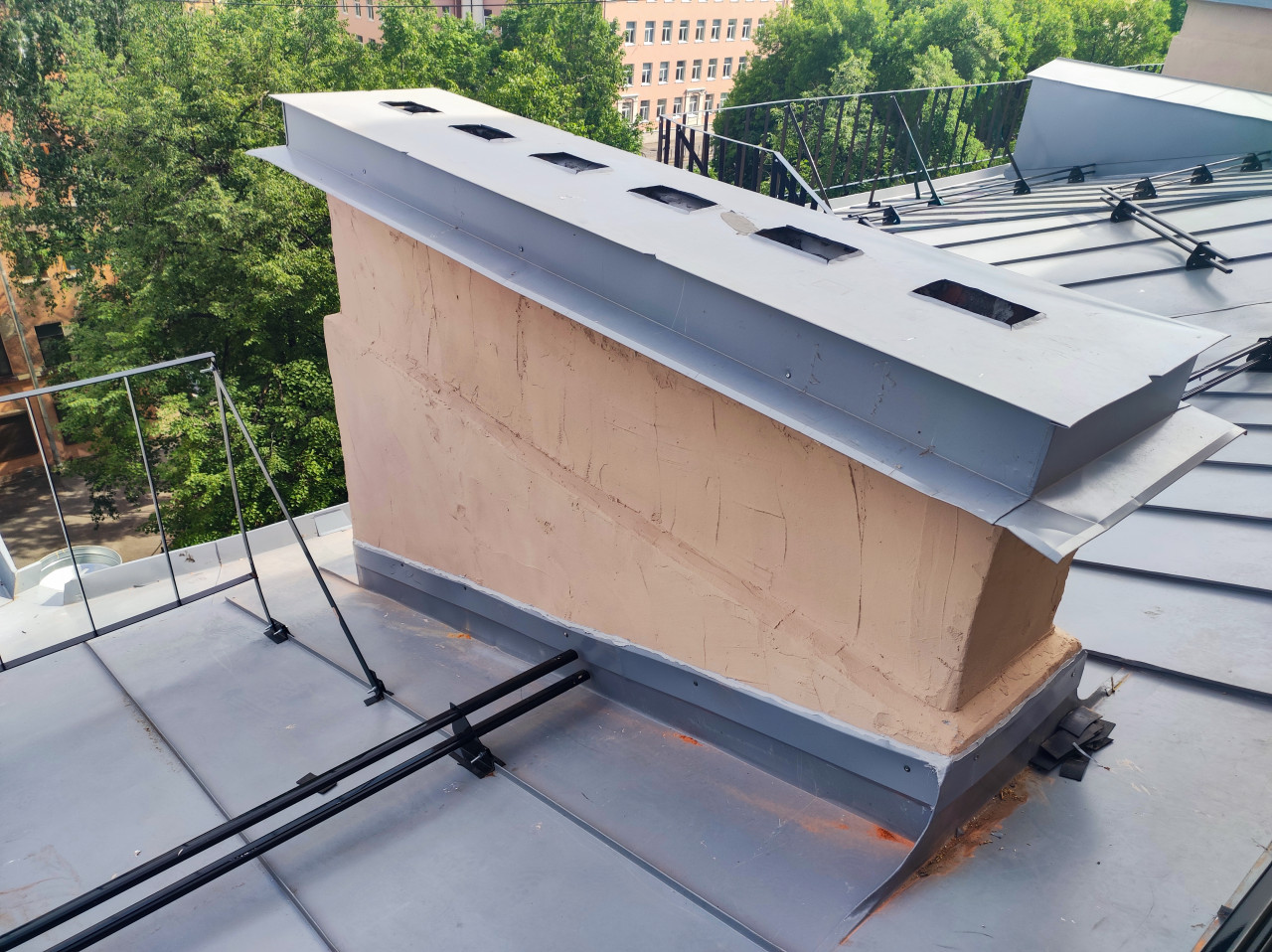 крыша кровля металлическая кровля фальцевая кровля ремонт кровли строительство инженерные системы вентиляция вытяжка вентиляционная шахта вентиляционный короб кровельный узел примыкание окантовка гидроизоляция листовой металл снегозадержатели ограждение крепления обслуживание здания ремонт эксплуатация техосмотр городская среда деревья зелень лето вид сверху жилой домПохожие фотографии