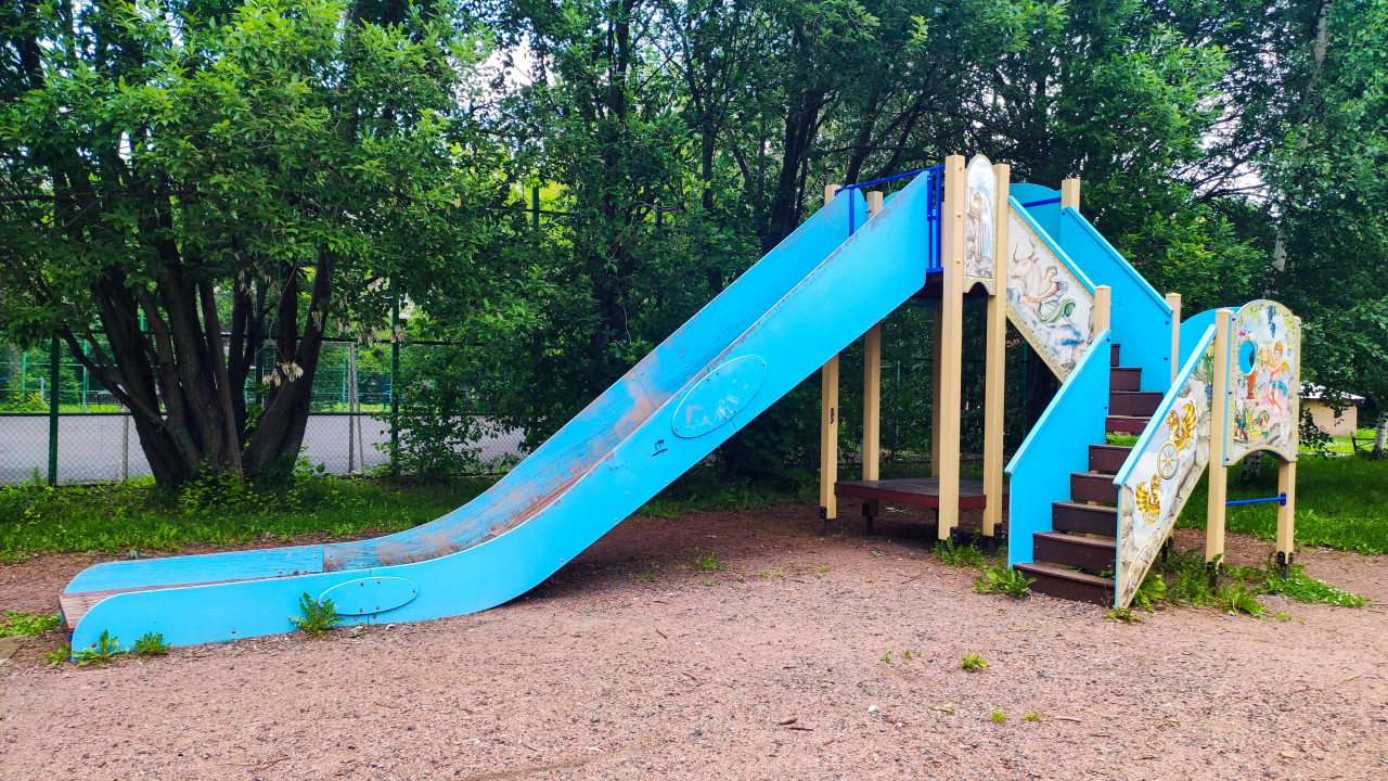 благоустройство детская площадка детские развлечения детский отдых детский досуг детское оборудование игровая зона игровое оборудование игровая площадка игровой комплекс развлечение физическая активность детство город двор улица лето зелёные деревья песок горка длинная горка лестница перила деревянные настилы иллюстрации на панелях уличные игры безопасность пустая площадка городская среда прогулка семейный отдых яркая окраска синяя горка дворовая территория зона отдыхаПохожие фотографии
