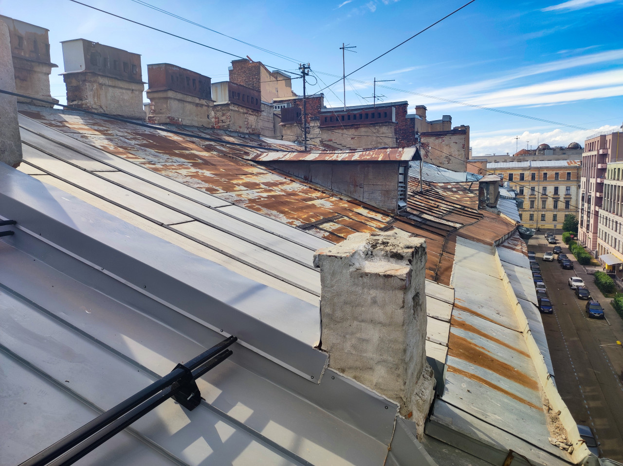 крыша кровля металлическая кровля фальцевая кровля ремонт кровли город металлическая крыша старая крыша ржавчина коррозия износ ремонт крыши обследование технический осмотр дымоход дымовые трубы вентиляционные каналы кирпичные трубы антенны провода инженерные коммуникации городская застройка вид с высоты улица исторические дома фасады безопасность кровельные работы металл небо летоПохожие фотографии