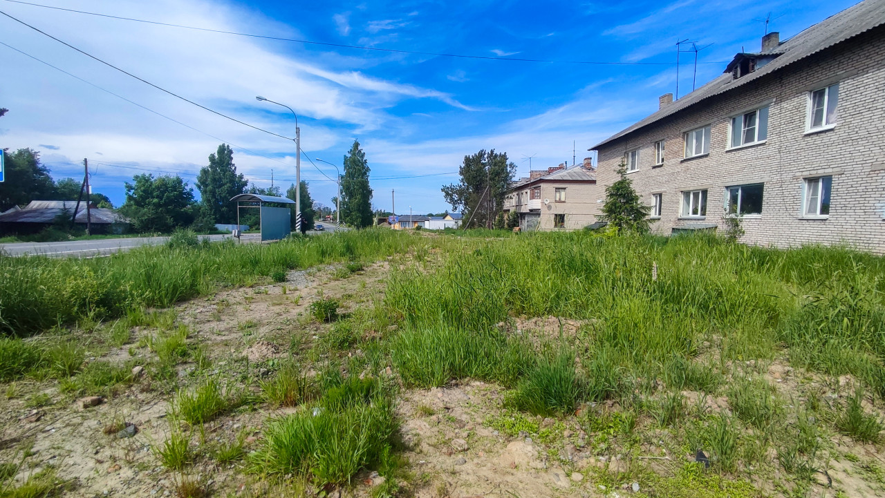 Улица с автобусной остановкой и кирпичным домом у заросшего пустыря