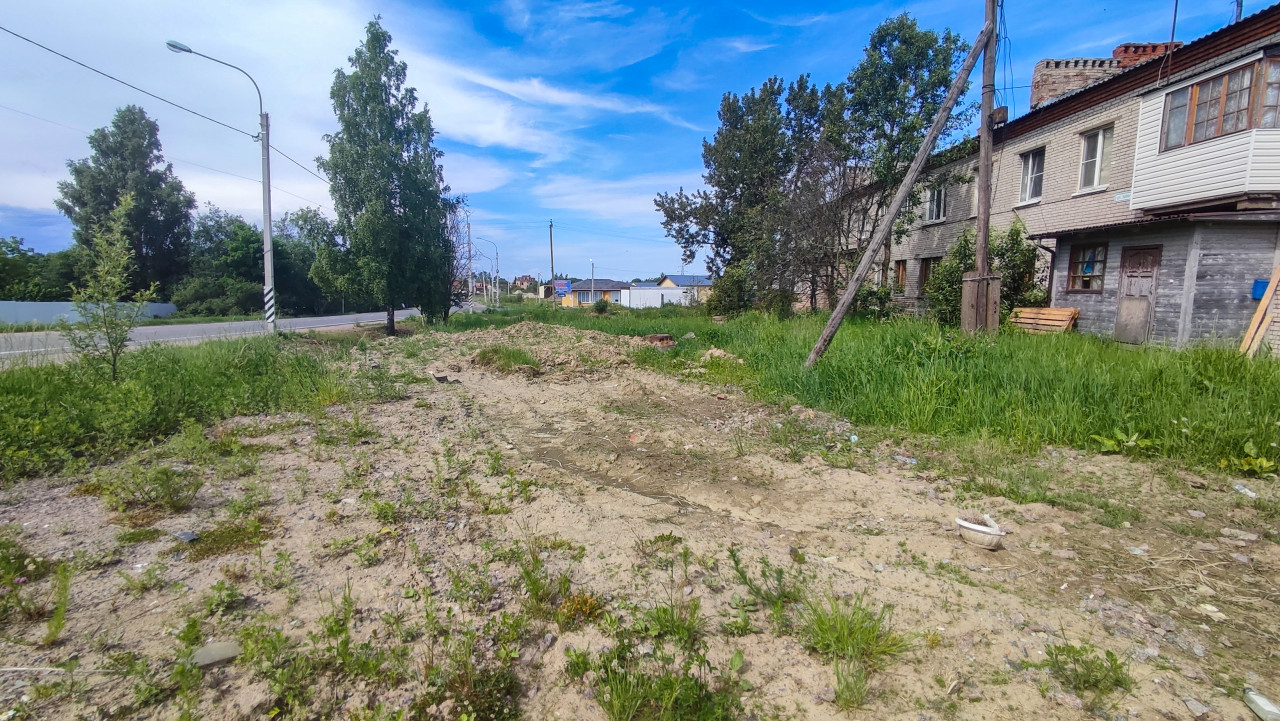 Уличный пейзаж с участком нарушенного грунта: на переднем плане песчаная площадка с неровностями, камнями и редкой травой, заметны следы земляных работ. Слева проходит дорога со столбами освещения и зелёными насаждениями. Справа расположен кирпичный жилой дом с окнами, дверью и пристройкой, рядом стоит наклонная опора с проводами и деревянные щиты у стены. В глубине видны деревья и низкие здания, небо яркое с облаками. Фото подходит для материалов о состоянии дворовых территорий, ремонте инфраструктуры, благоустройстве и городской среде.