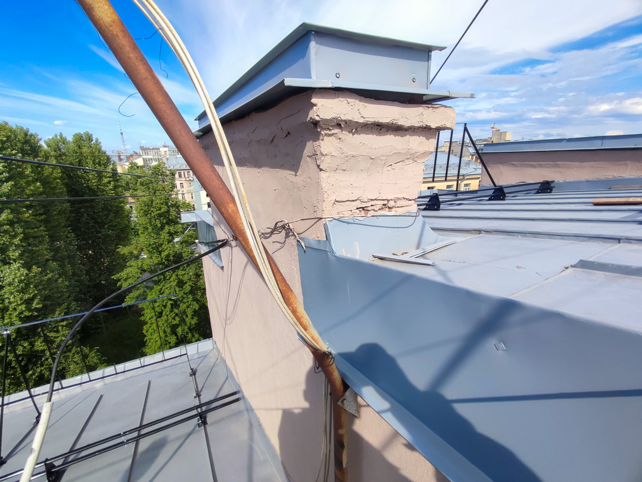 На фотографии показана вентиляционная шахта или дымоход на крыше: оштукатуренная конструкция с трещинами и неровностями перекрыта металлическим колпаком. Рядом проходит ржавый металлический стояк и несколько кабелей, закреплённых вдоль стены и кровельного элемента. Видна фальцевая кровля с продольными швами и креплениями, а также тень фотографа на металле. Слева в фоне заметны кроны деревьев и городские здания. Фото подходит для материалов о кровельных узлах, инженерных коммуникациях, ремонте вентиляционных выходов и эксплуатации зданий.