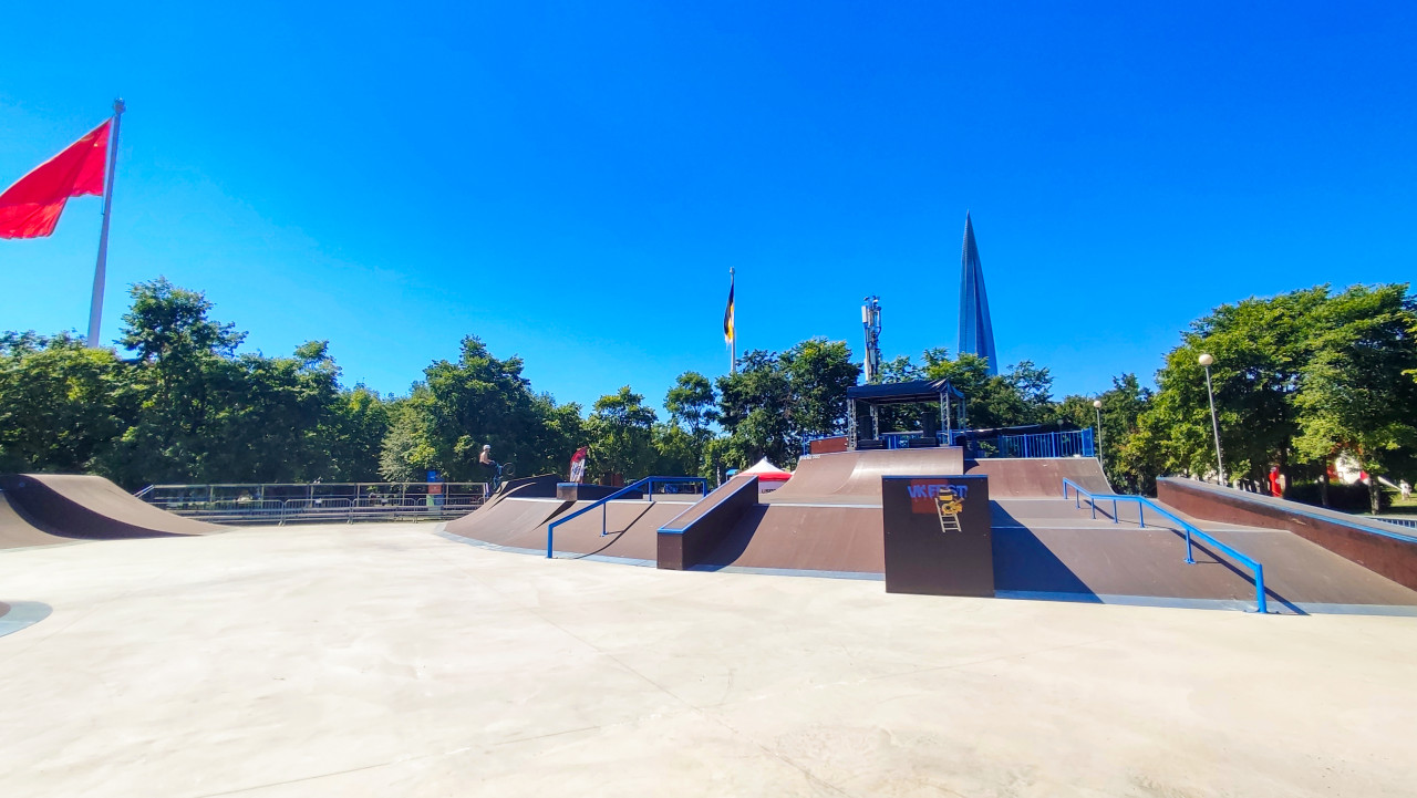 Скейтпарк с перилами и сценой на фоне флагов СССР и Российской империи, вдалеке «Лахта Центр»