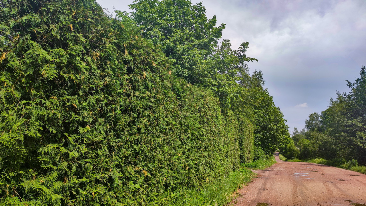 Крупный план высокой живой изгороди, выстроенной ровной зелёной стеной вдоль обочины. Хорошо читается фактура хвои и листвы, местами заметны сухие веточки и свежий прирост. Справа проходит грунтовая дорога с колеёй и небольшими лужами, уходящая в перспективу; у кромки — трава и влажная земля. На заднем плане видны кроны деревьев, небо частично затянуто серыми облаками, свет мягкий после дождя. Снимок подойдёт для материалов о ландшафтном дизайне, живых ограждениях, уходе за зеленью и загородных улицах.