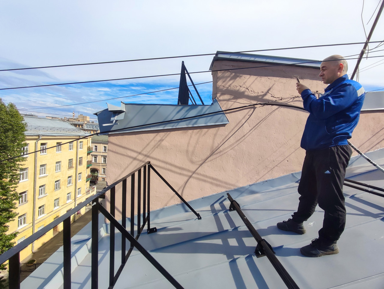 На плоской металлической крыше стоит мужчина в синей куртке и тёмных брюках, он держит в руках смартфон и смотрит на экран. В кадре видны ограждение и лестничные перила, крепёжные стойки на кровле, а также натянутые над крышей кабели, отбрасывающие тени. На заднем плане — двор и фасады соседних домов с окнами и аркой проезда, слева частично попадает зелёная крона дерева. Использование: материалы о работе на высоте, обслуживании зданий и городской среде. По положению человека и ограждений видно, что съёмка ведётся на высоте, с акцентом на безопасный доступ и технический осмотр.