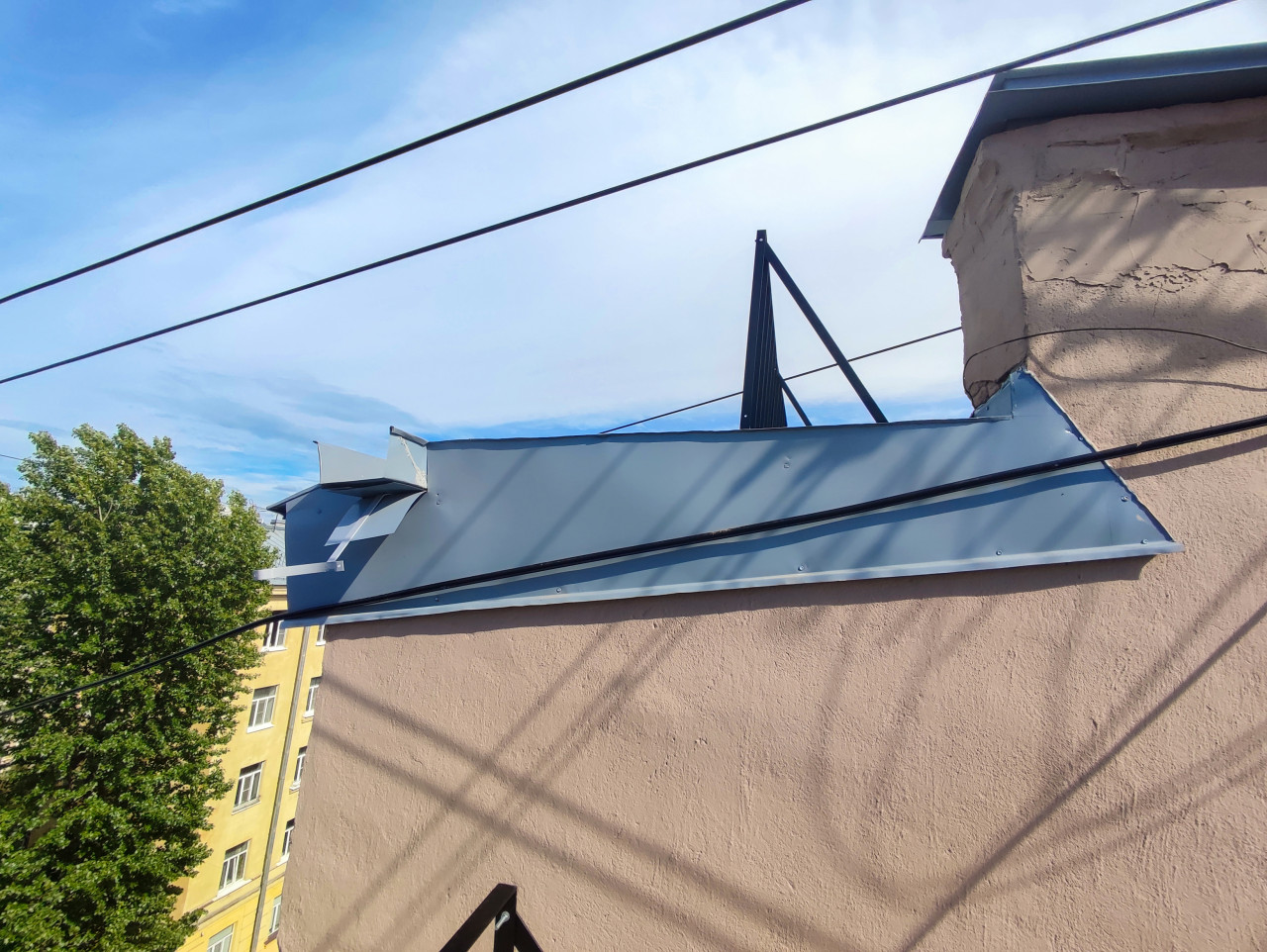 крыша кровля металлическая кровля фальцевая кровля ремонт кровли архитектура кровельный отлив кровельная накладка узел примыкания парапетная стенка штукатурный фасад воздушные кабели провода тени от проводов металлическая стойка кронштейн вентиляционный короб город жилой дом двор дерево зелень окна дома небо облака летний день эксплуатация здания кровельные работы строительная детальПохожие фотографии