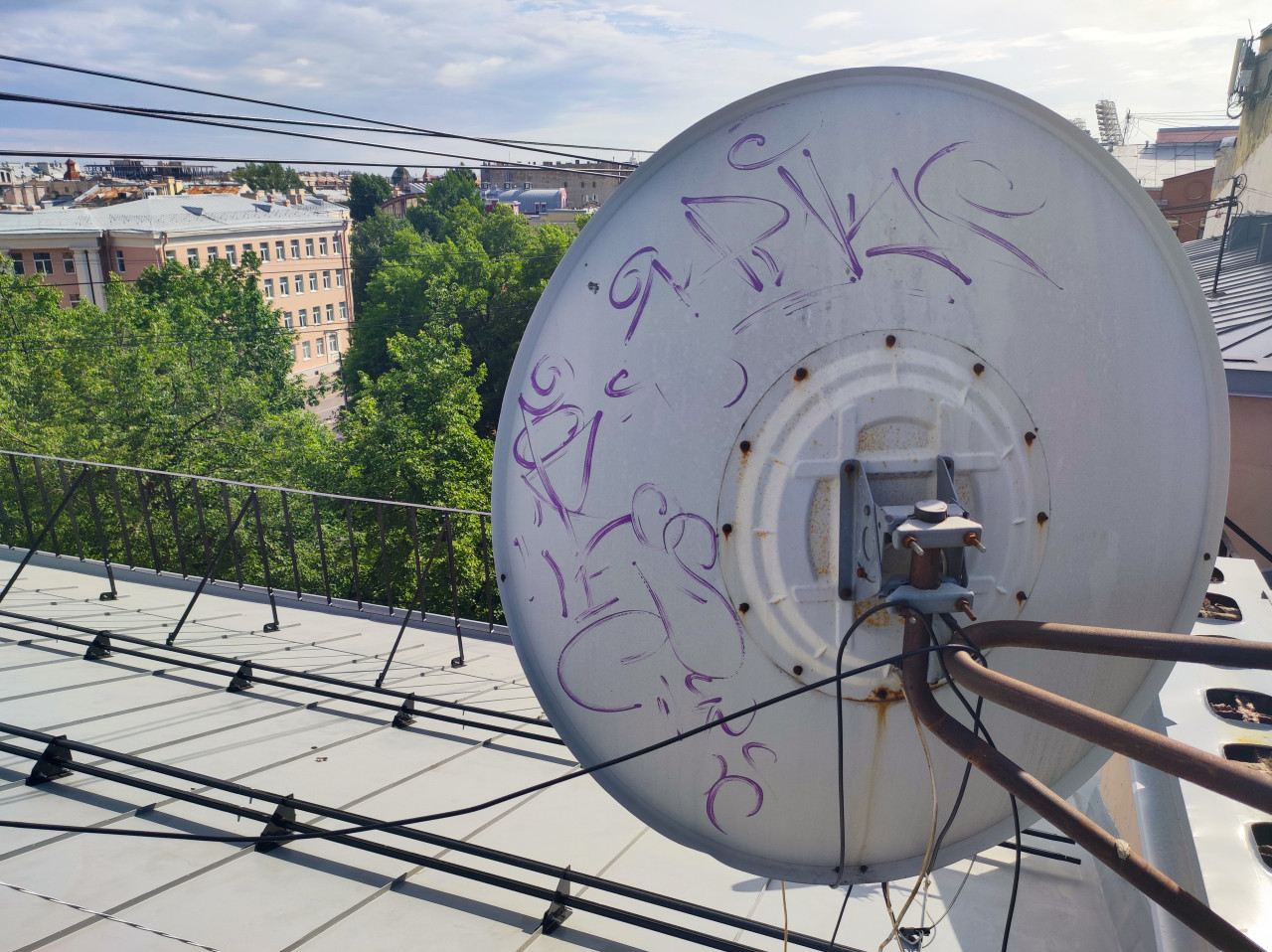 Крупный план спутниковой антенны на крыше: на тарелке видны надписи, по ободу и в центре — точки крепежа, к кронштейну подключены кабели. На заднем плане — зелёные деревья, фасады домов и линия горизонта города, сверху проходят натянутые провода. Металлическая кровля с фальцами и ограждение крыши уходят в перспективу. Съёмка днём при мягком солнечном свете. Использование: иллюстрации для тем про спутниковую связь, городскую инфраструктуру и крыши. На антенне видны мелкие загрязнения и следы коррозии на крепеже, что делает кадр подходящим для тем про обслуживание оборудования.