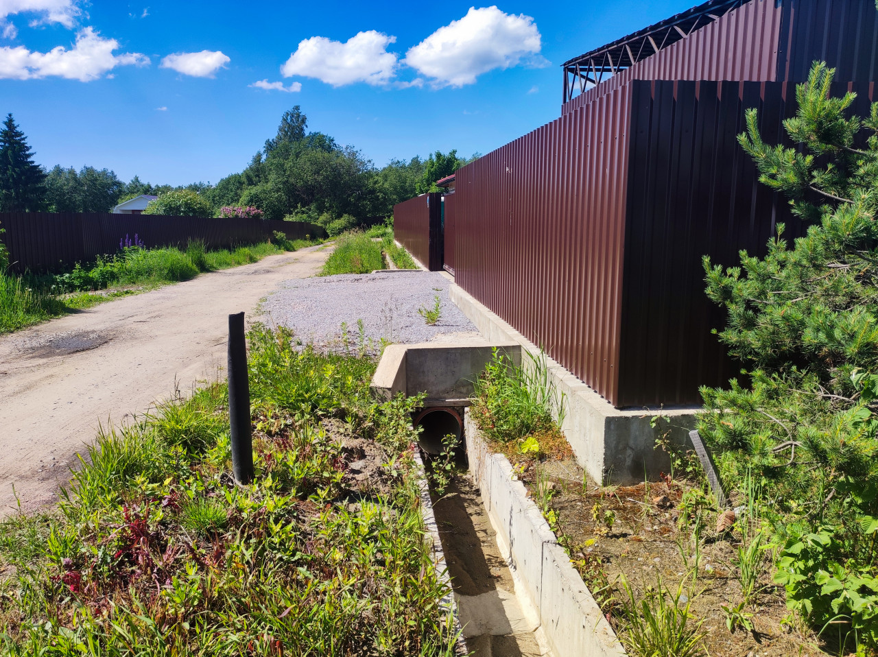 деревня село поселок сельская местность сельский пейзаж загород загородная местность пригород загородная жизнь жизнь за городом провинция сельская жизнь поселение инфраструктура водоотвод дренаж дренажная канава бетонная канава ливневая канализация труба водопропускная труба оголовок трубы заезд во двор подъезд щебень подсыпка грунтовая дорога частный сектор забор из профлиста коричневый забор благоустройство участка строительство ремонт сорняки трава кустарники сосна лето небо облакаПохожие фотографии