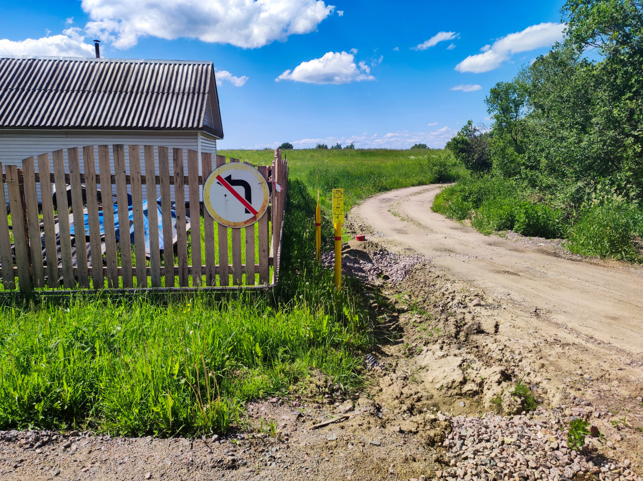 деревня село поселок сельская местность сельский пейзаж загород загородная местность пригород загородная жизнь жизнь за городом провинция сельская жизнь поселение частный дом деревянный забор дорожный знак поворот налево запрещён правила дорожного движения организация движения грунтовая дорога поворот дороги обочина щебень подсыпка земляные работы поле луг кустарники зелёная трава небо облака сигнальный столбик маркировка коммуникаций подземные сети предупредительная табличка крышка колодца придорожная зона летний деньПохожие фотографии