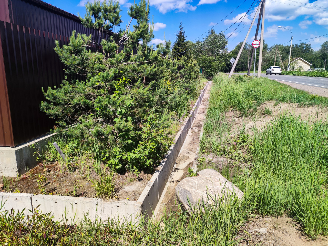 Бетонный водоотводный лоток вдоль забора у шоссе и дорожный знак «обгон запрещён»