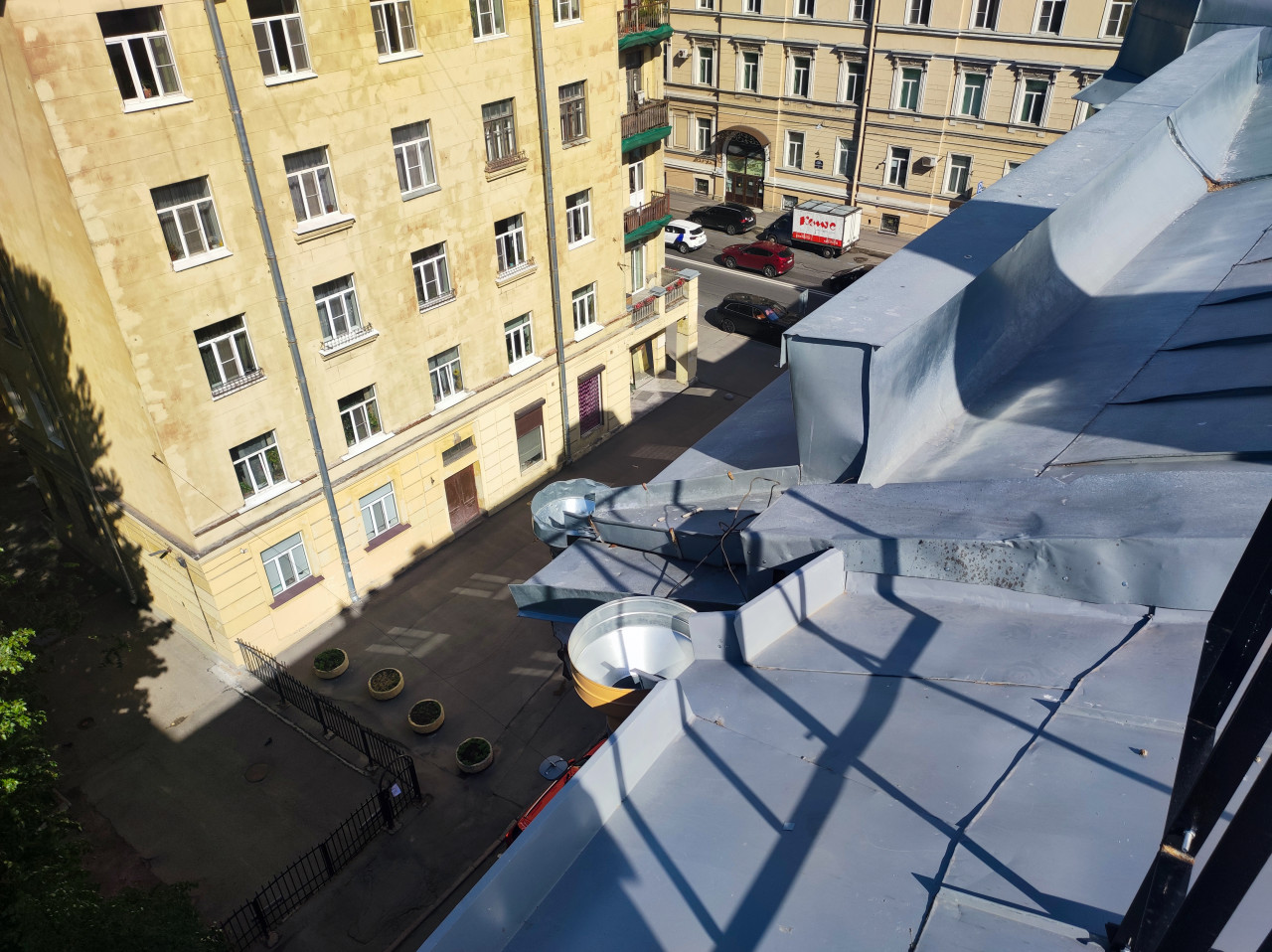 крыша кровля металлическая кровля фальцевая кровля ремонт кровли город крыши водоотвод водосборная воронка внутренняя ливнёвка стык металла примыкания ограждение на крыше тени двор жилой дом фасады зданий окна балконы водосточные трубы двор проезд припаркованные автомобили городская инфраструктура провода высотный ракурс дневной свет эксплуатация зданий ЖКХПохожие фотографии
