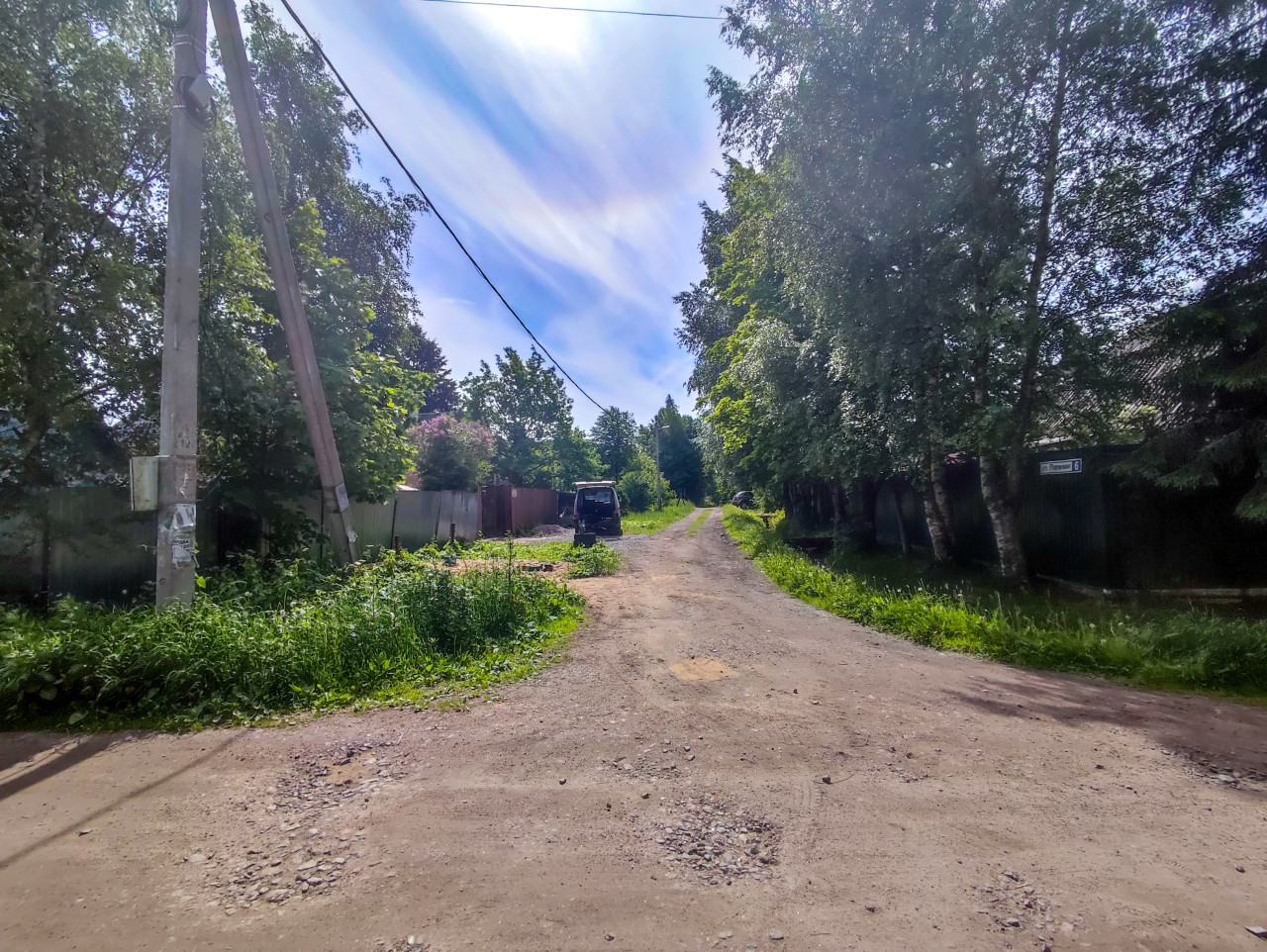 Грунтовая улица с заборами, опорой ЛЭП и адресной табличкой «ул. Полевая, 6»