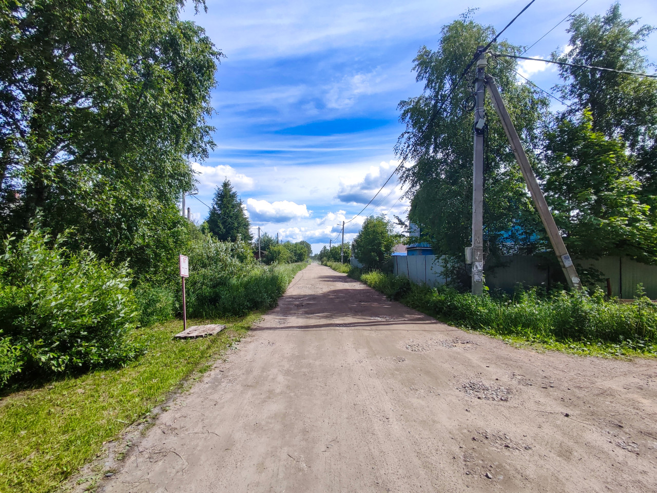 Прямая грунтовая дорога с опорами связи и воздушными проводами в частном секторе