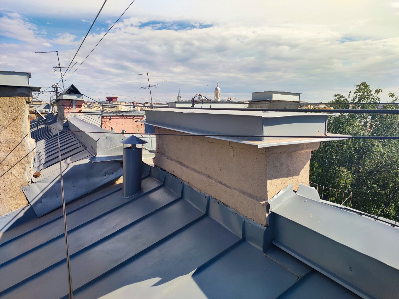 Съёмка вдоль кровли: серые металлические скаты с фальцами переходят к парапетам и оштукатуренным надстройкам, закрытым металлическими колпаками. В центре видна вентиляционная труба с защитным зонтом, по крыше проложены провода, на заднем плане антенны и элементы инженерных сетей. Справа кроны деревьев, вдали читается купол здания на горизонте, но без идентификации объекта. Свет дневной, облачность переменная. Фото подойдёт для тем про вентиляцию, кровельные системы и обслуживание зданий; использование: техматериалы, статьи, презентации, портфолио подрядчика.