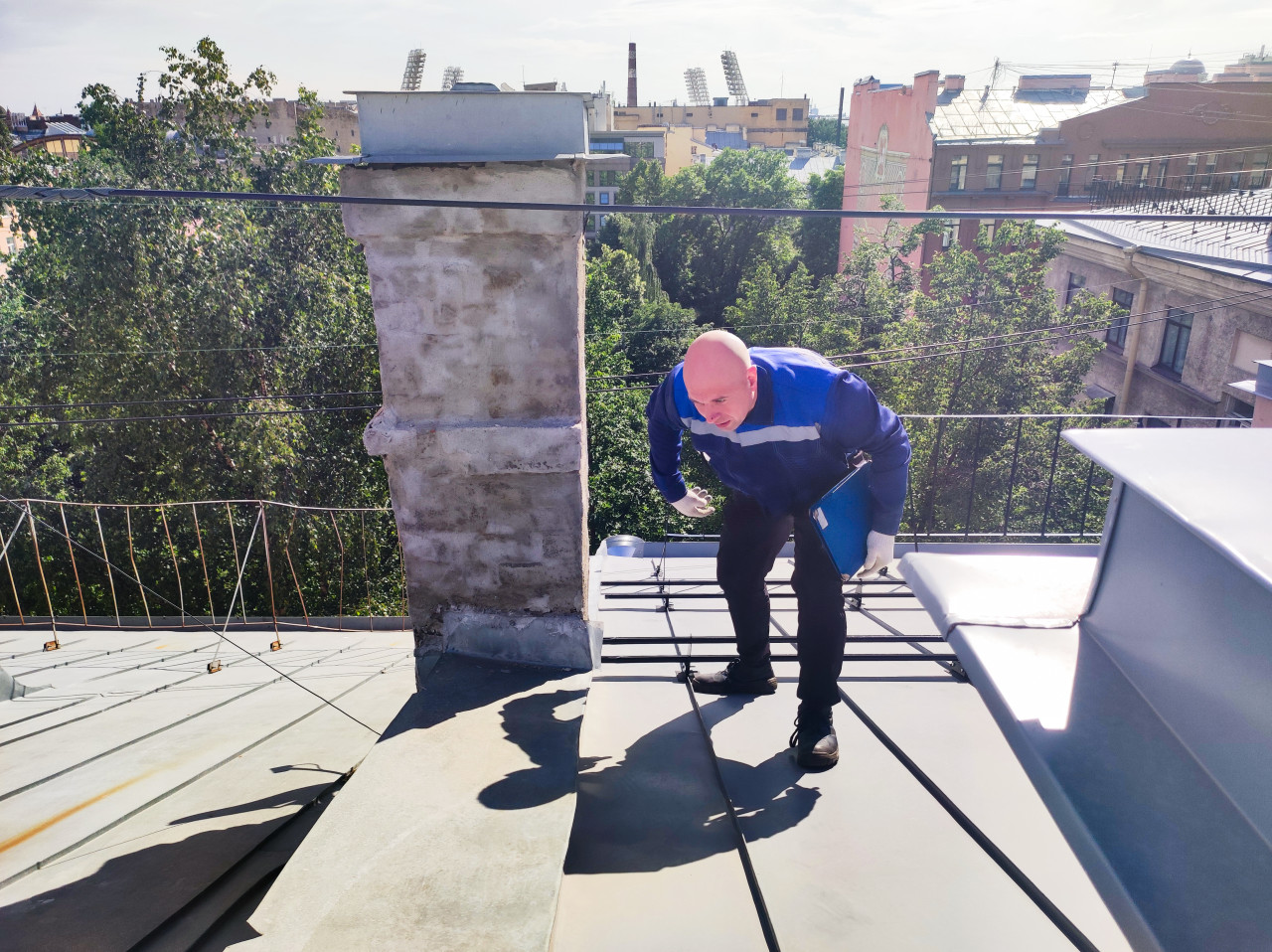 На крыше многоквартирного дома мужчина в рабочей форме наклоняется возле оштукатуренной дымовой трубы с металлическим колпаком. На кровле видны фальцевые листы, чёрные кабели, крепления и тени от элементов, по периметру проходит ограждение. На заднем плане деревья и фасады соседних домов, над крышей протянуты провода. Сцена снята при дневном свете; человек держит папку и работает в перчатках. Фото подходит для материалов о ремонте и осмотре кровли, работе на высоте, эксплуатации зданий, ЖКХ и техническом обслуживании.
