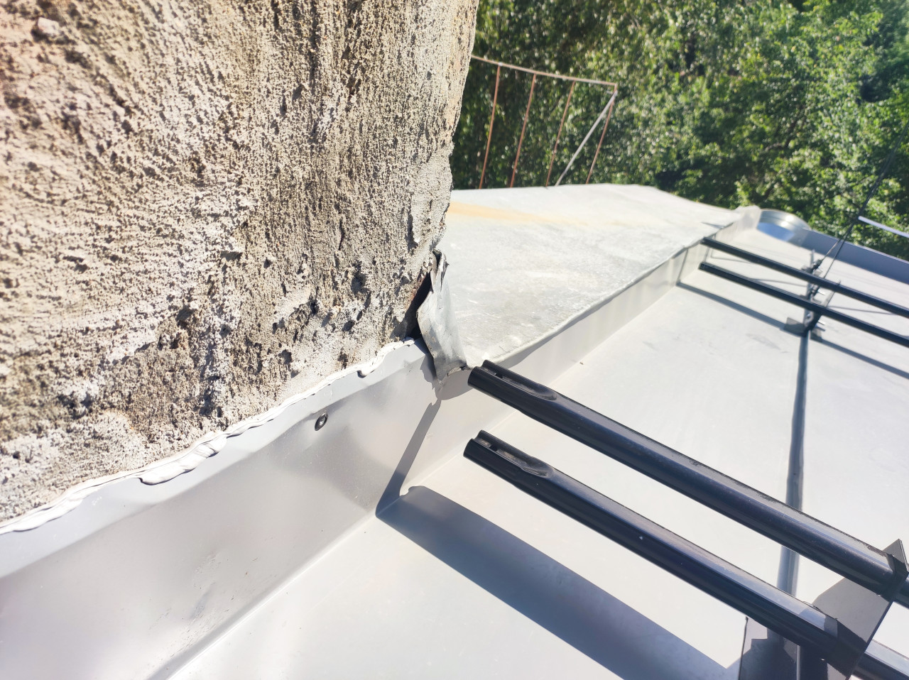 Кадр показывает основание оштукатуренной трубы на металлической фальцевой кровле: вокруг установлен металлический фартук, по краю заметен слой герметика, в углу примыкания есть зазор и деформация металла. Справа в кадре проходят чёрные планки снегозадержателей и их крепления, на заднем плане видна зелёная крона деревьев и ограждение крыши. Освещение дневное, детали узла читаются крупно. Фото подходит для материалов о ремонте кровли, герметизации примыканий, защите от протечек, монтаже снегозадержателей и техническом осмотре зданий.