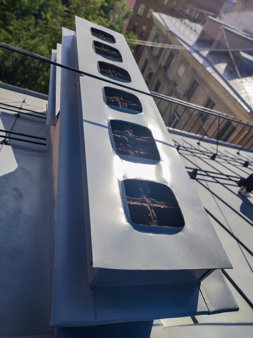 Вертикальный ракурс на металлический короб вентиляции: сверху установлен кожух с последовательностью прямоугольных отверстий, внутри которых заметны отложения и мусор. Через кадр проходит кабель, на фоне видны элементы ограждения и снегозадержателей, а дальние здания и деревья размыты. Свет отражается от металла, подчёркивая форму крышки и кромок. Снимок подходит для иллюстраций про устройство вентиляционных выходов на крышах, диагностику загрязнений, обслуживание инженерных систем, отчёты управляющих компаний и статьи о ремонте кровельных конструкций.