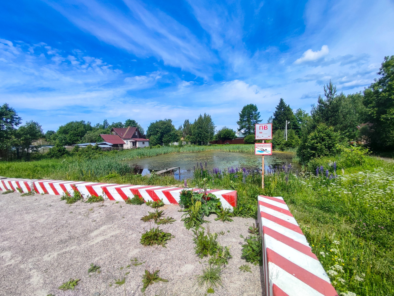 деревня село поселок сельская местность сельский пейзаж загород загородная местность пригород загородная жизнь жизнь за городом провинция сельская жизнь поселение лето пейзаж панорама водоем пруд пожарный водоем табличка ПВ купаться запрещено предупреждение безопасность бетонные блоки ограждение красно белые полосы берег камыш ряска зеленая трава частные дома деревья голубое небо перистые облака ясная погода простор пожарная профилактикаПохожие фотографии