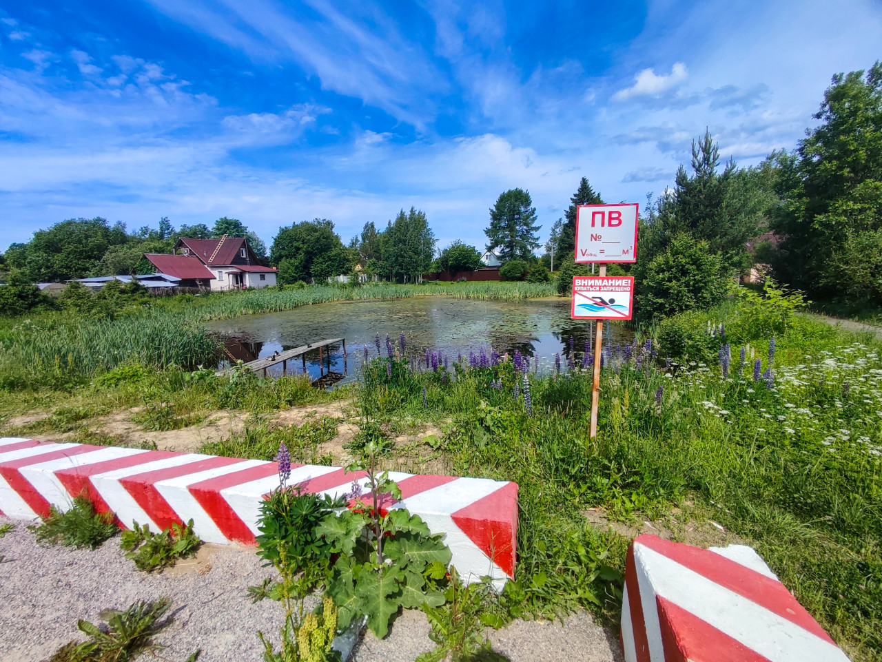 деревня село поселок сельская местность сельский пейзаж загород загородная местность пригород загородная жизнь жизнь за городом провинция сельская жизнь поселение лето дневной свет водоем пруд пожарный водоем пожарная инфраструктура табличка ПВ параметры водоема купаться запрещено предупреждающий знак безопасность у воды бетонные блоки ограничители красно белая разметка берег камыш ряска деревянный настил мостик люпины луговые цветы высокая трава частные дома деревья экологияПохожие фотографии