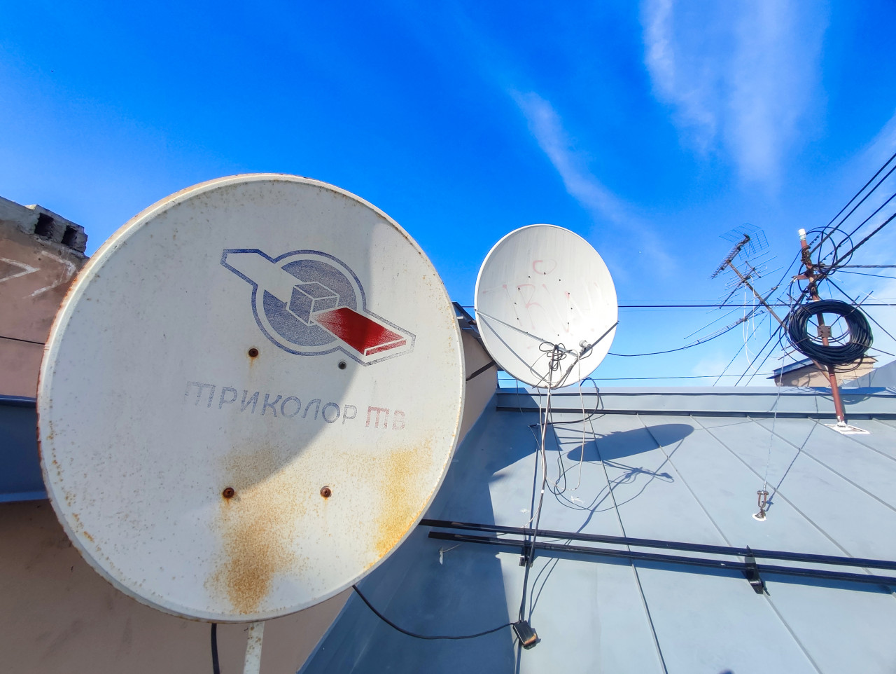 Съёмка на крыше: в кадре две спутниковые тарелки, одна из них с маркировкой «Триколор ТВ», вторая установлена ближе к коньку. Виден комплект кабелей, идущих по кровле и свисающих к креплению приёмного блока, а также кольцо из намотанного провода на мачте справа. Рядом расположена эфирная телевизионная антенна с решётчатыми элементами. Металлическая кровля окрашена в серый цвет, по листам проходят фальцевые швы; тени от антенн подчёркивают солнечную погоду и чистое небо с тонкими облаками. Фото подойдёт для иллюстраций о подключении ТВ, прокладке кабелей и сервисе связи.