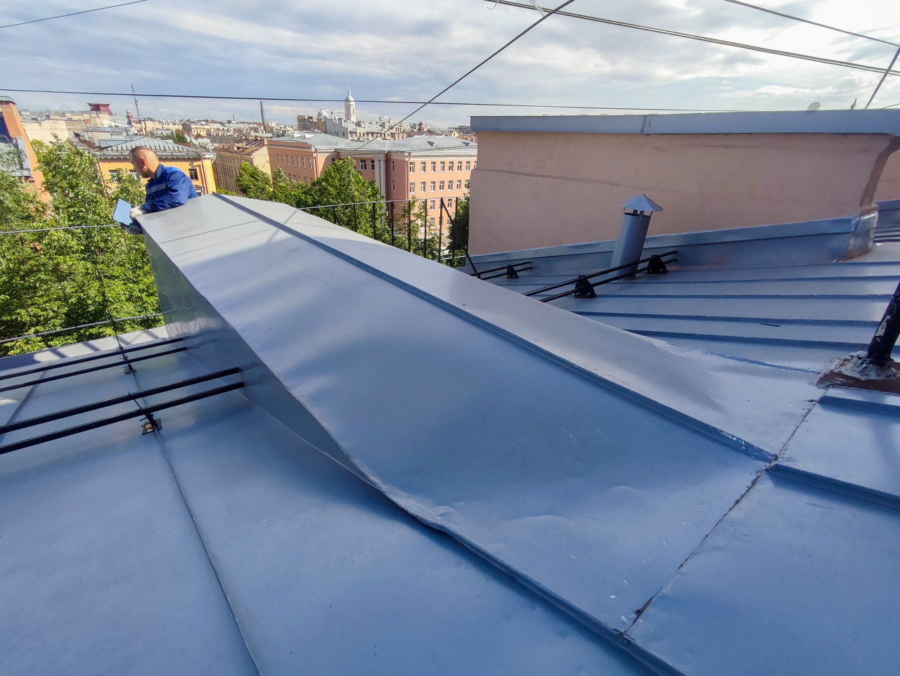крыша кровля металлическая кровля фальцевая кровля ремонт кровли строительство ремонт кровельные работы металлическая крыша лист металла деформация металла монтаж демонтаж строительная площадка рабочий ремонт здания обслуживание эксплуатация ограждение на крыше безопасность на высоте вентиляционный вывод инженерные системы городская панорама городские крыши деревья облачное небо строительный контроль инструменты промышленная безопасность городская инфраструктураПохожие фотографии