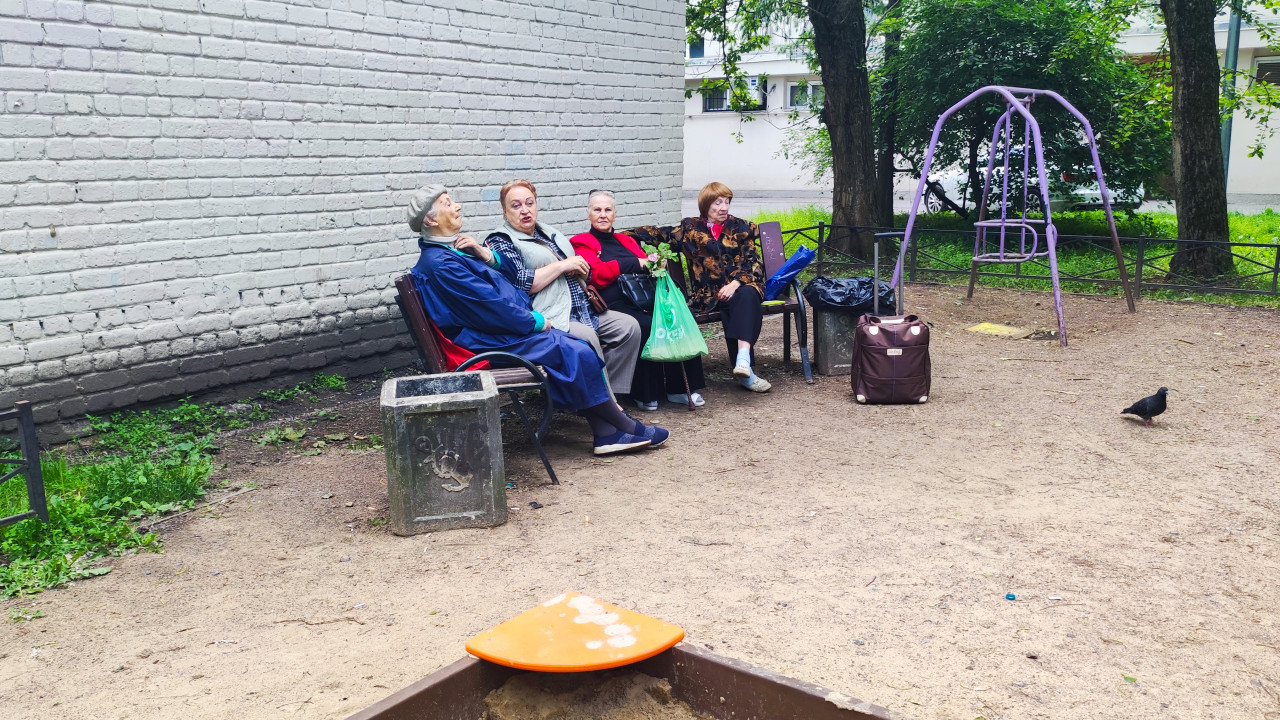 город люди пожилые люди пенсионеры повседневная жизнь городской двор жилой район двор жилой двор городская среда повседневность женщины скамейка кирпичная стена фасад дома детская площадка качели деревья кусты зелень песок грунт голубь урна сумки отдых общение соседи уличная сцена бытовой сюжет лето многоквартирный домПохожие фотографии