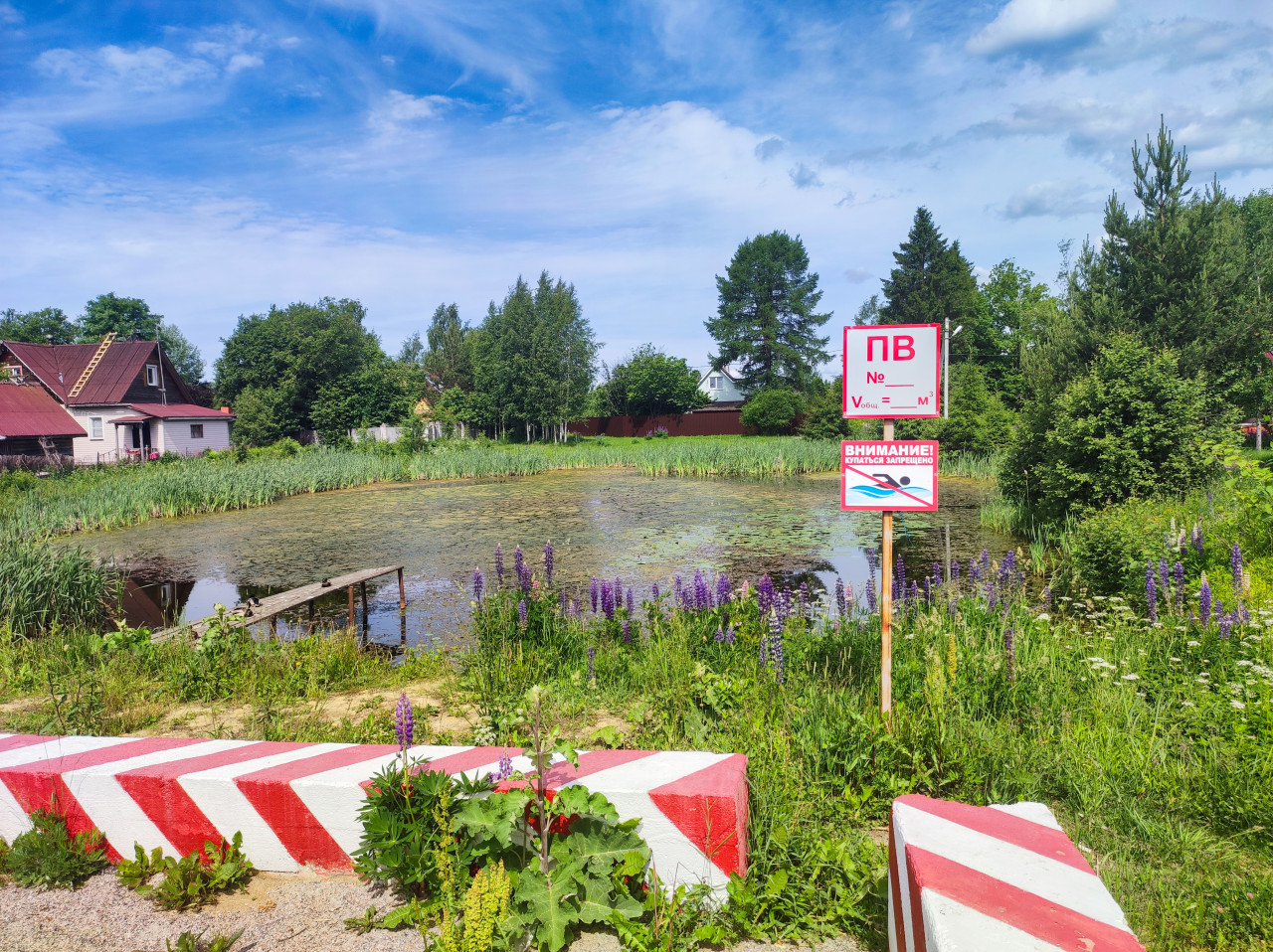 деревня село поселок сельская местность сельский пейзаж загород загородная местность пригород загородная жизнь жизнь за городом провинция сельская жизнь поселение лето природа частный сектор водоем пруд пожарный водоем пожарная безопасность табличка ПВ предупреждение купаться запрещено знак запрета правила безопасности бетонные блоки ограждение красно белая окраска берег камыш ряска водная гладь деревянный настил причал луговая трава люпины фиолетовые цветы жилые дома деревья экологияПохожие фотографии