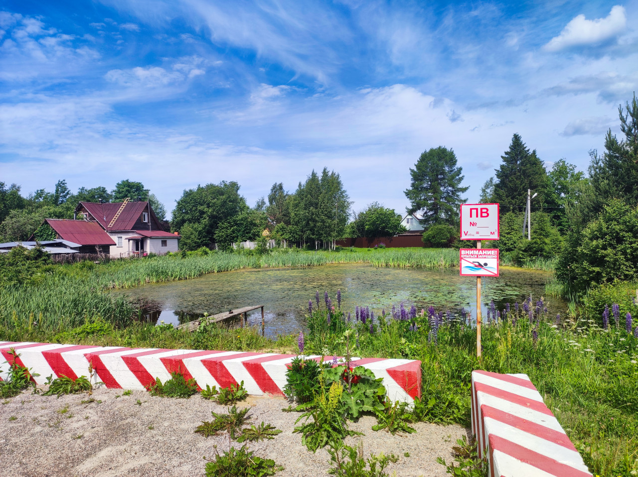 деревня село поселок сельская местность сельский пейзаж загород загородная местность пригород загородная жизнь жизнь за городом провинция сельская жизнь поселение лето дневной свет природа водоем пруд берег камыш ряска отражение неба частный сектор жилой дом забор деревья предупреждающий знак табличка ПВ купаться запрещено пожарный водоем безопасность бетонные блоки ограничители красно белая разметка трава луг синее небо облака загородная инфраструктураПохожие фотографии