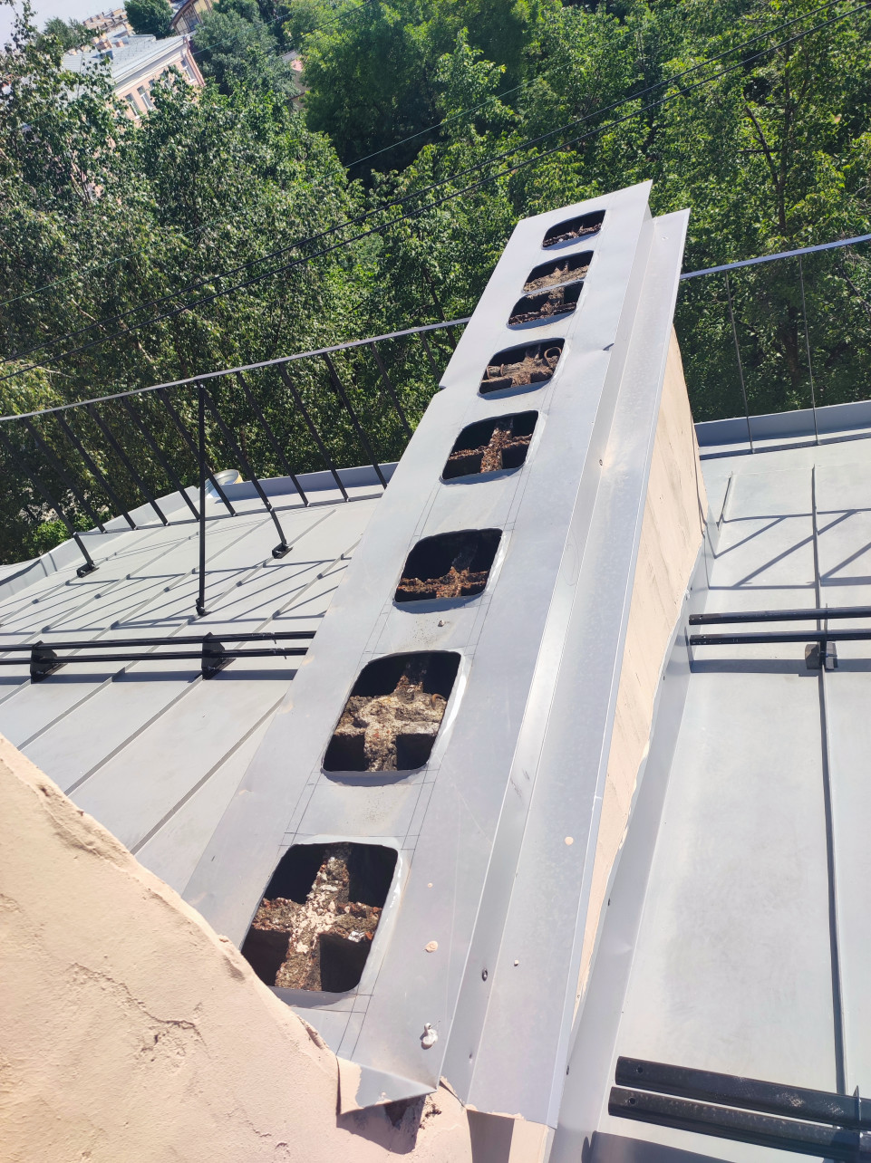 Крупный вертикальный вид вентиляционной шахты на крыше: сверху установлена металлическая накладка с рядом прямоугольных отверстий, в каждом видны отложения и мусор. По плоскости крышки заметны следы разметки и крепёж, кромки металла отгибаются по форме шахты. На фоне читаются ограждение кровли, снегозадержатели, а также линии проводов и густая зелёная крона деревьев. Освещение дневное. Фото подходит для статей о состоянии вентиляционных выходов, обслуживании и очистке, технических обследованиях крыш и эксплуатации жилых зданий.
