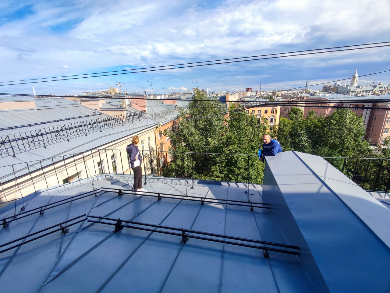 Широкий вид с крыши: на переднем плане металлическая кровля с фальцевыми швами и установленными направляющими/креплениями, по периметру проходит ограждение безопасности. На крыше находятся два человека, один стоит у края, второй опирается на крупный металлический короб или накладку. Над кадром протянуты провода, на горизонте видны плотная городская застройка, силуэты крыш, мачты и башенки, а также купольные сооружения вдали без читаемых вывесок. Небо переменной облачности, свет дневной. Снимок подходит для материалов о техническом осмотре крыш, обслуживании зданий, работах на высоте и городской инфраструктуре.