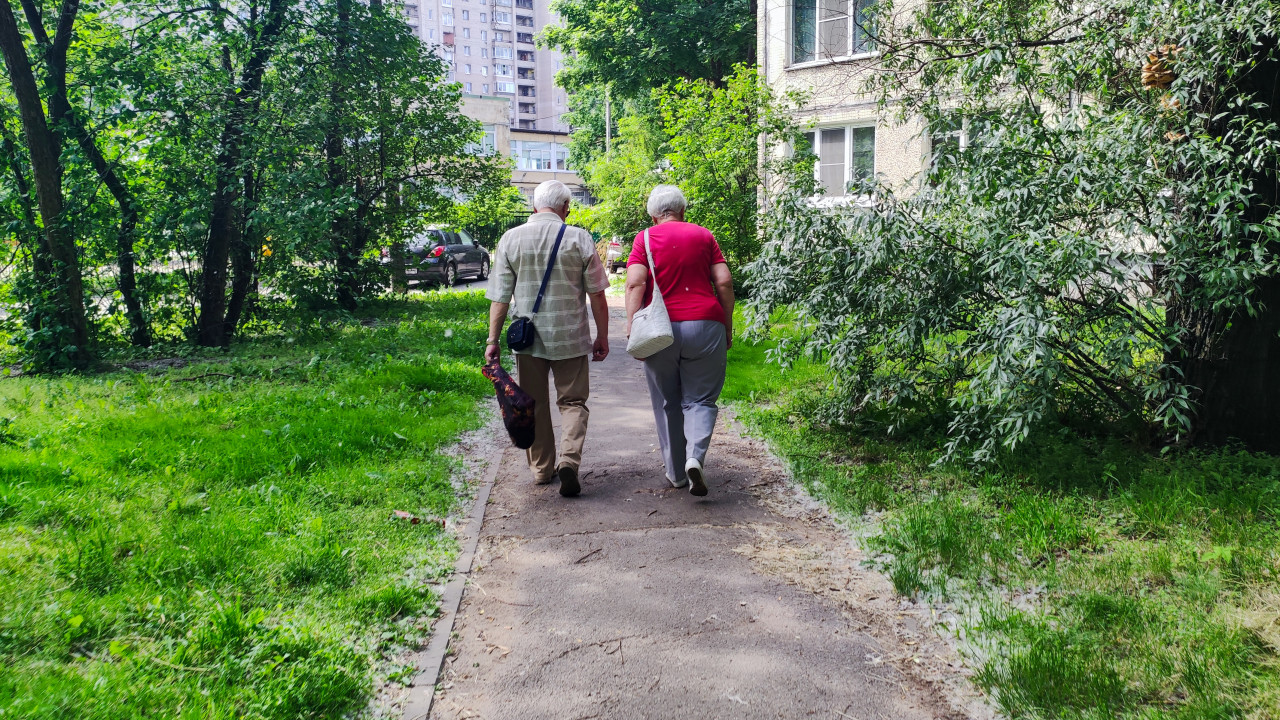 Пожилая пара идёт по узкой асфальтовой дорожке среди зелёных насаждений во дворе многоквартирного дома. Камера расположена ближе: видны детали одежды, сумки через плечо и шаг людей, вокруг густые кусты, трава и деревья, справа фасад дома с окнами и балконами. В глубине кадра просматриваются припаркованные машины и высотный дом, а свет мягкий дневной, с тенями от листвы, что характерно для лета. Снимок подчёркивает тему спокойной прогулки и городской повседневности. Подходит для публикаций о здоровье пожилых, доступной среде, жилых кварталах и зелёных дворах.