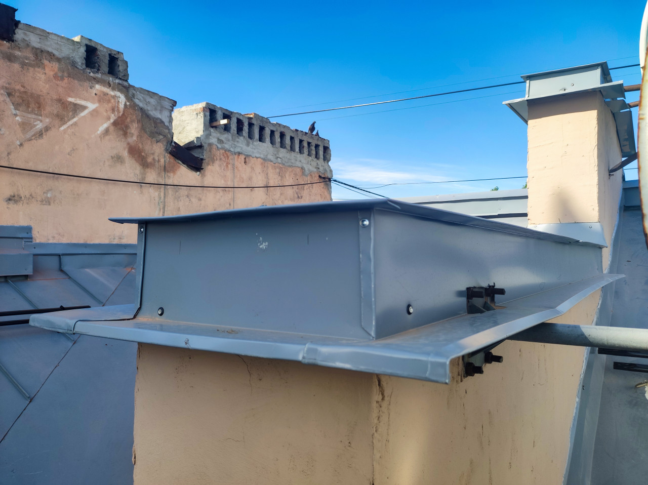 крыша кровля металлическая кровля фальцевая кровля ремонт кровли вентиляционная шахта дефлектор металлический колпак козырёк инженерные системы вентиляция здания провода кабели городской дом парапет кирпич штукатурка износ крепёж стыки металла техническое обслуживание эксплуатация строительные детали безопасность птица на парапете фальцевая крыша серый металл городская среда дневной свет синее небоПохожие фотографии