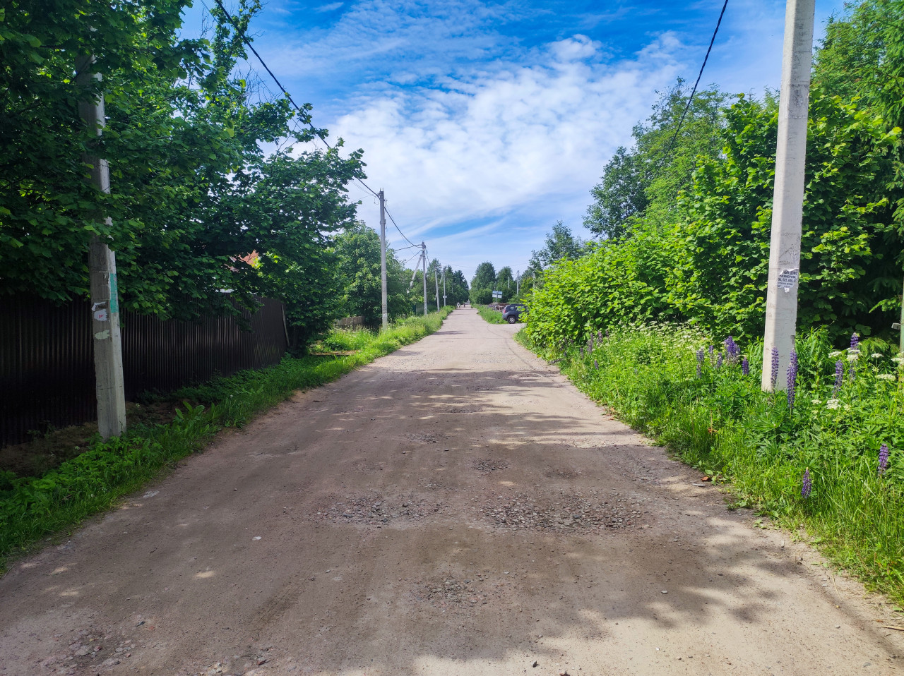 Просёлочная улица с забором, луговой травой и домами вдалеке