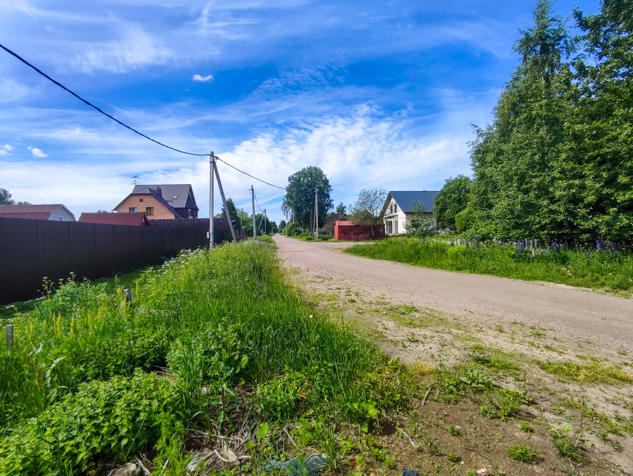Сельская улица в летний сезон: слева тянется высокий тёмный забор, вдоль него растёт высокая трава и луговые растения. Дорога грунтовая, слегка изогнута, уходит к частным домам и деревьям на горизонте. Над улицей проходят провода, видны опоры и линий связи. Небо голубое с белыми облаками, освещение дневное. Снимок подходит для тем загородной недвижимости, спокойных жилых районов, сельской инфраструктуры, ландшафта средней полосы и дорожной среды в посёлках.