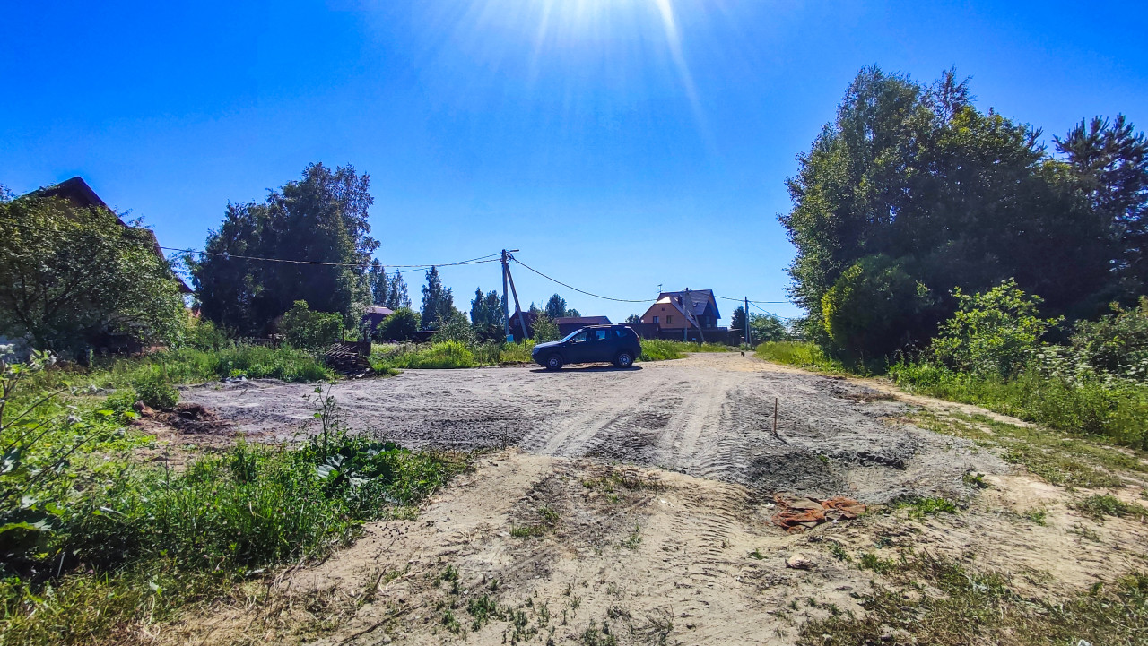 На фото широкий участок грунтовой дороги и разровненная площадка с песком и четкими следами колесной техники. В центре кадра припаркован темный автомобиль, вдали видны частные дома с двускатными крышами, кустарники и высокие деревья. Через кадр проходят провода, стоят опоры линии электропередачи. По обочинам растет высокая трава, местами заметны кучки грунта и остатки материалов у края дороги. Съемка сделана в июне 2024 и подходит для публикаций о сельской инфраструктуре, дорожных работах и благоустройстве территории.