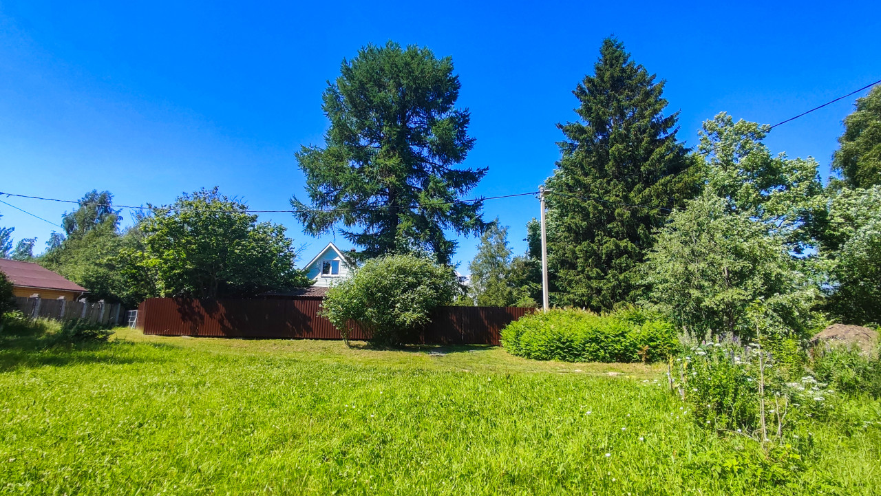 На фото открытая зеленая территория с ровным газоном и группой высоких деревьев, включая хвойные, на фоне яркого голубого неба. По заднему плану проходит темный забор, за ним видна часть частного дома. В центре кадра установлен столб, через участок проходят провода, рядом заметны кустарники и густые заросли у границы территории. Съемка сделана в июне 2024 и подходит для иллюстраций о дачной жизни, загородном ландшафте, озеленении, недвижимости и материалах про спокойные пригородные районы.