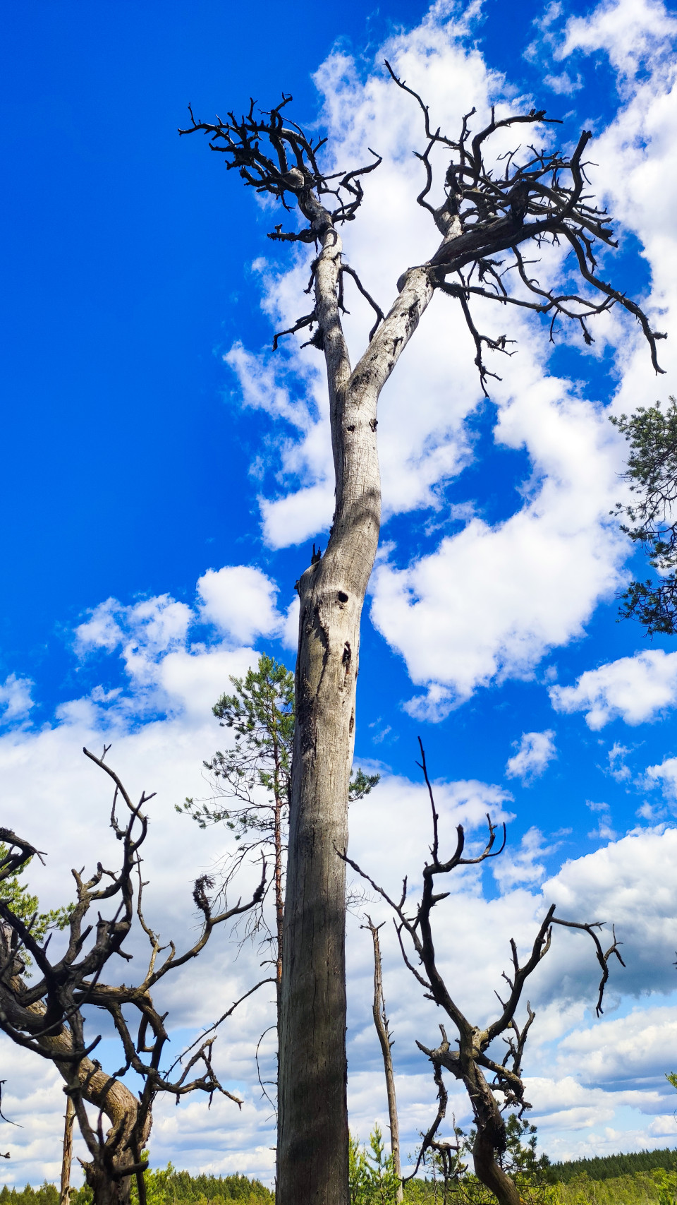 природа лес дерево ствол дерева ветви лесной ландшафт природная среда небо облака синее небо сухое дерево сухостой мертвый ствол силуэт дерева вертикальный кадр редколесье болото заболоченная местность тайга север природный ландшафт дикая природа экология усыхание леса последствия пожара климат природные изменения минимализм контраст лето дневной свет пейзажПохожие фотографии