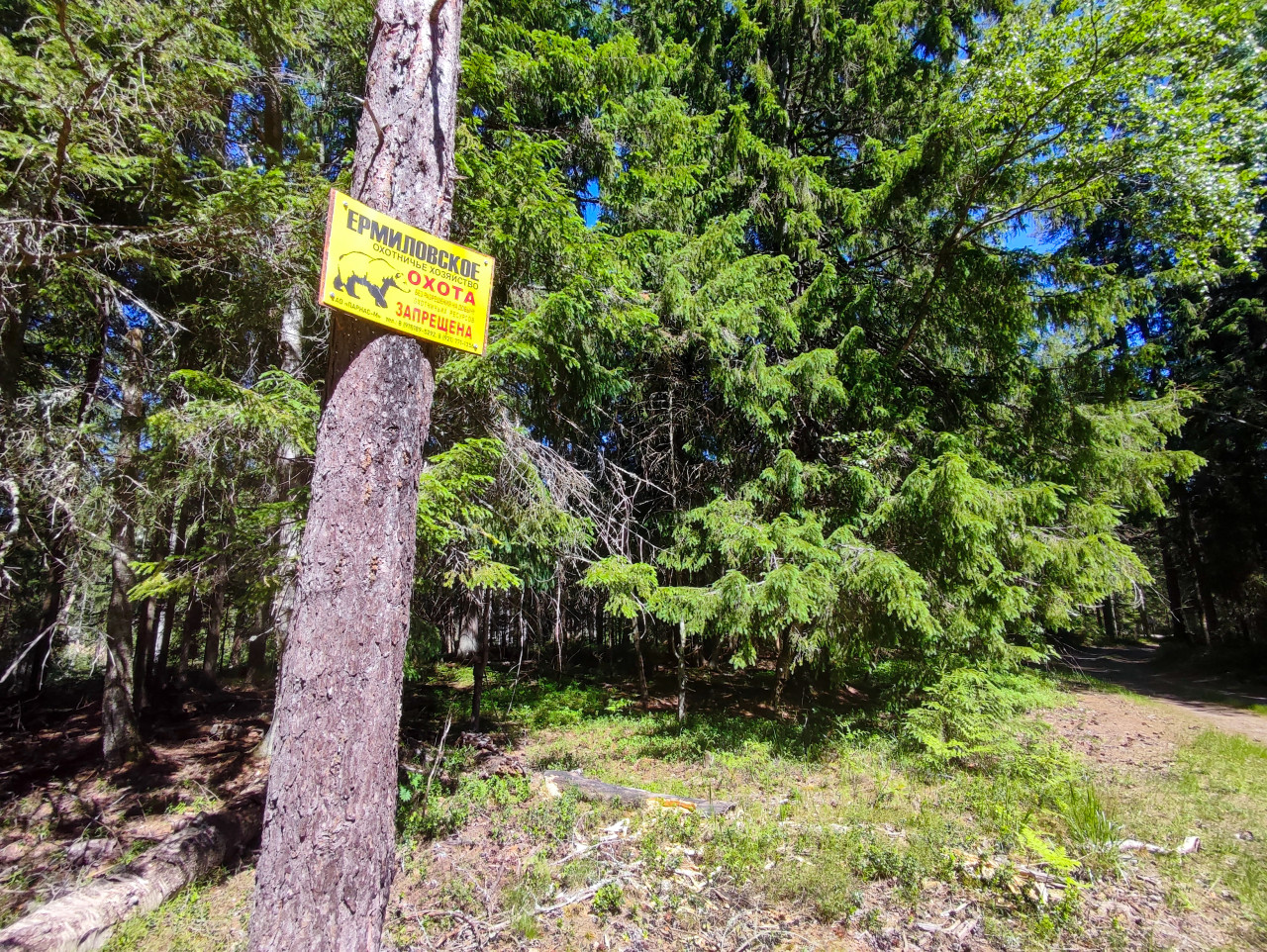 Лесной пейзаж с жёлтой предупреждающей табличкой, закреплённой на стволе сосны: на щите читается «Ермиловское охотничье хозяйство» и крупная надпись о запрете охоты без разрешения. Вокруг плотный хвойный лес с елью и молодым подростом, под ногами мох, трава и сухие ветки. Справа проходит грунтовая дорога, уходящая в тень деревьев, что задаёт направление движения и контекст прогулки. Съёмка выполнена днём при ярком солнце и синем небе. Фото можно использовать для материалов о правилах посещения леса, охотугодьях, безопасности и навигации на природе.