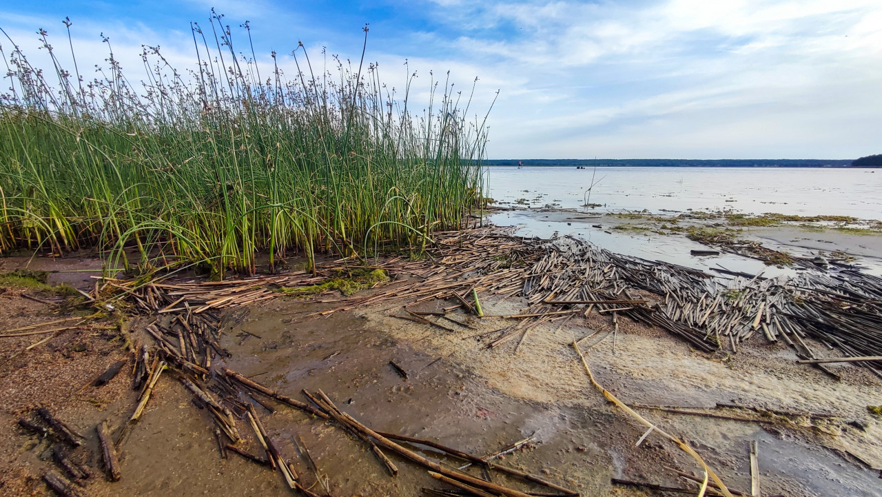 Пейзаж берега: слева плотная полоса камыша, у основания мокрый песок и ил, местами заметна зелёная водная растительность. По линии прибоя лежат обломанные тростниковые стебли и древесный мусор, часть собрана в небольшие гряды. Вода спокойная, уровень низкий, берег пологий, вдали тёмная линия леса на противоположной стороне озера. Небо голубое с тонкими облаками, освещение дневное, летнее. Кадр можно использовать для тем о природных водоёмах, береговой динамике, экологии прибрежной зоны, отдыхе у озера и иллюстраций к материалам о камышовых зарослях.